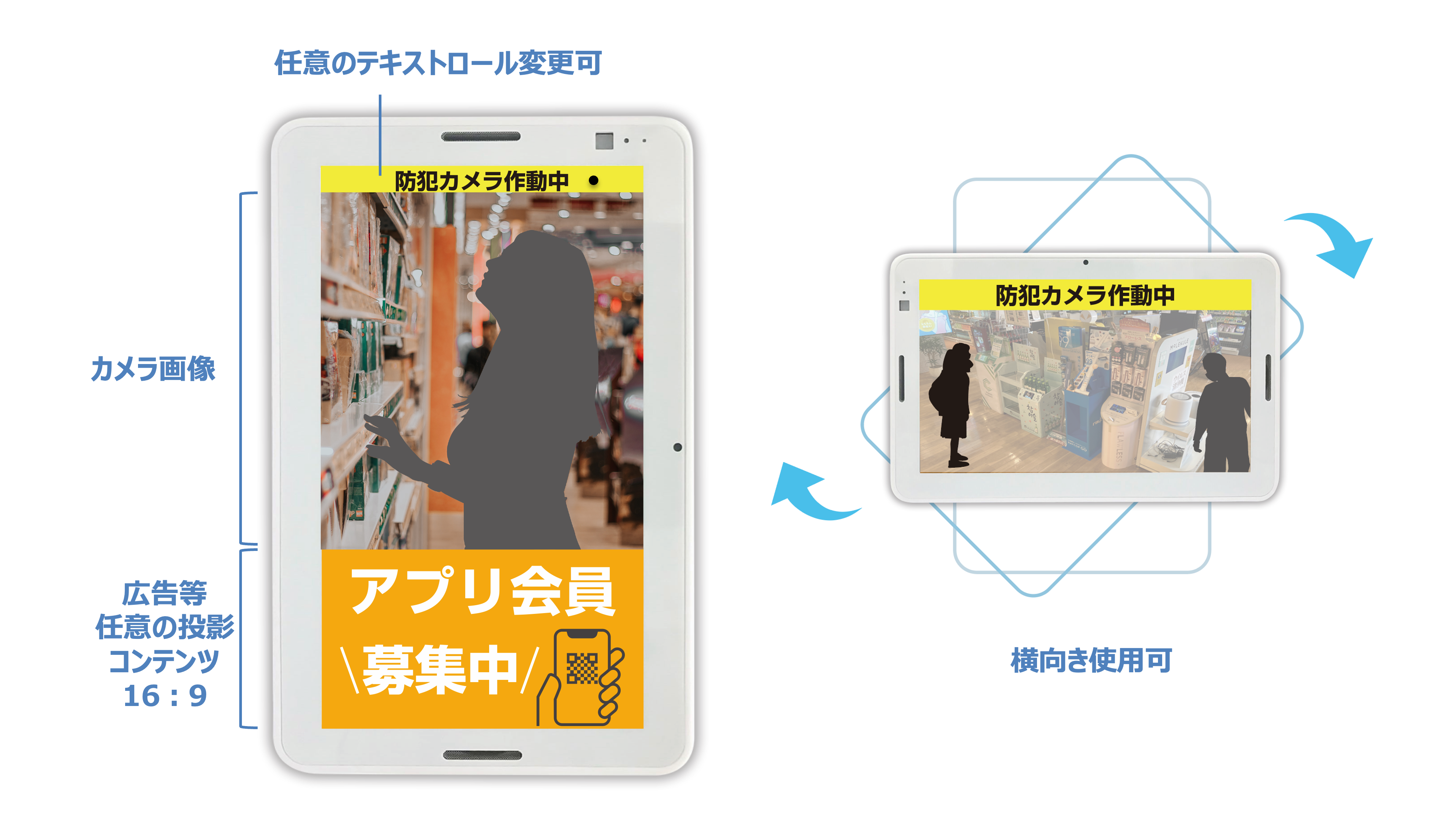 更に撮影ファイルは端末の内部メモリ、またはSDHCカード (別途オプション) に残すことができるため、防犯カメラの役割を果たすほか、画面に任意のテキストロールを流したり、画面の一部に別コンテンツを映し出したりすることも可能です。