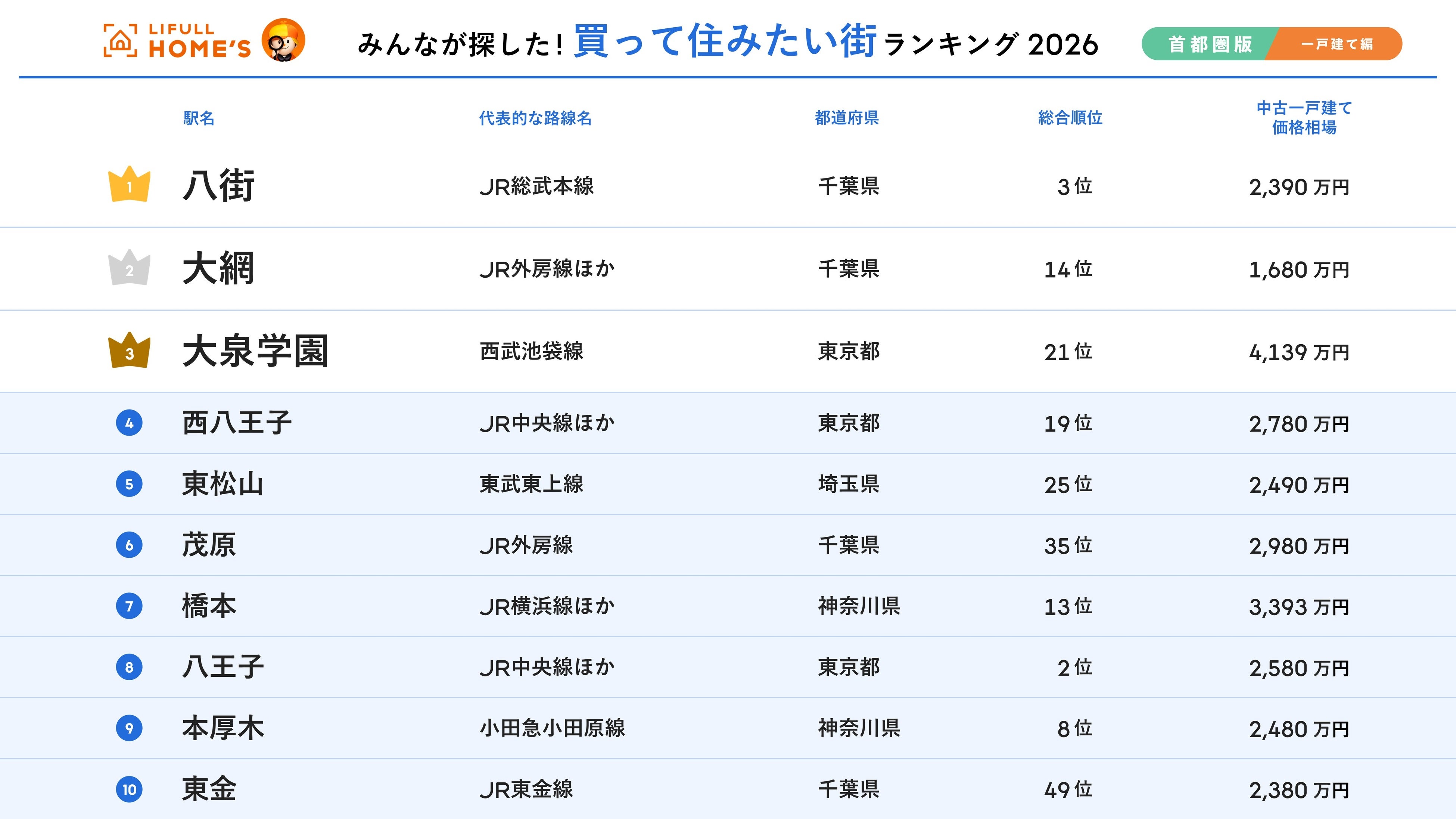 今回初めて発表する、首都圏の「買って住みたい街」について、一戸建てのみを集計した「2026年 LIFULL HOME'S みんなが探した!買って住みたい街ランキング(首都圏版・一戸建て購入編)」は、総合ランキング3位の「八街」が1位に輝きました。