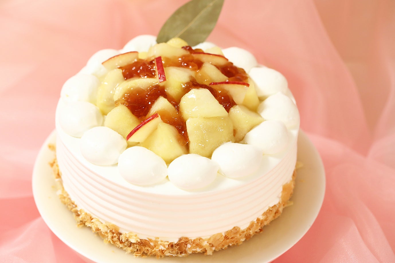 こだわり:旬のりんごを存分に使用したデコレーションケーキ。ピネードのふわふわなスポンジに、カスタードクリームとりんごのコンポート、ホイップクリームをサンドして仕上げました。トッピングにはりんごのコンポートと生のスライスりんごをのせているので、2つの食感が楽しめます。紅茶ゼリーの優しい香りが広がり、りんごのジューシーさも際立たせてくれます。