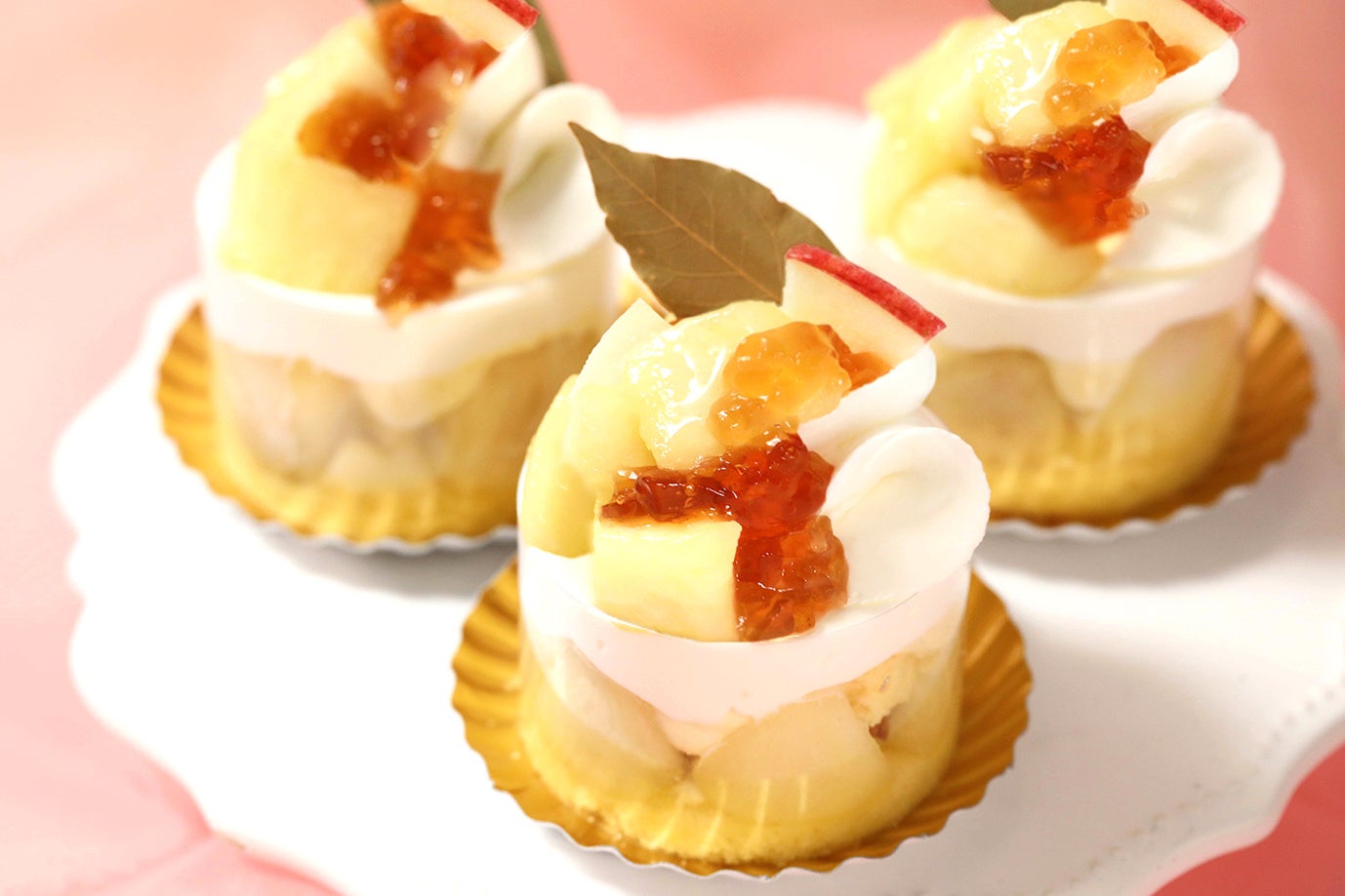 紅玉りんご、紅茶ゼリー、スポンジ、コクのあるディプロマットクリーム(カスタードクリームとホイップクリームを合わせたクリーム)、ホイップクリームを重ね、紅茶ゼリーで仕上げました。紅玉りんごはコンポートにすることで程よい酸味が生まれ、紅茶の優しい香りやホイップクリームの甘味、スポンジの組み合わせのマリアージュをお楽しみいただけます。