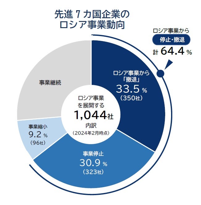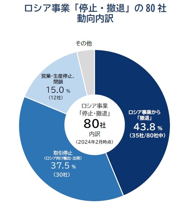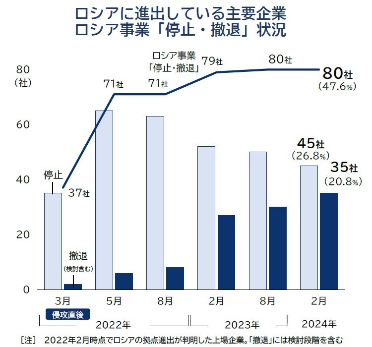ウクライナ侵攻直前(2022年2月時点)にロシアへの進出が判明していた国内上場企業168社のうち、2月21日までにロシア事業の停止や撤退を発表・公開した企業は合計で80社(47.6%)判明した。進出企業の約半数に上ったものの、23年8月以降の半年間で増減は無かった。