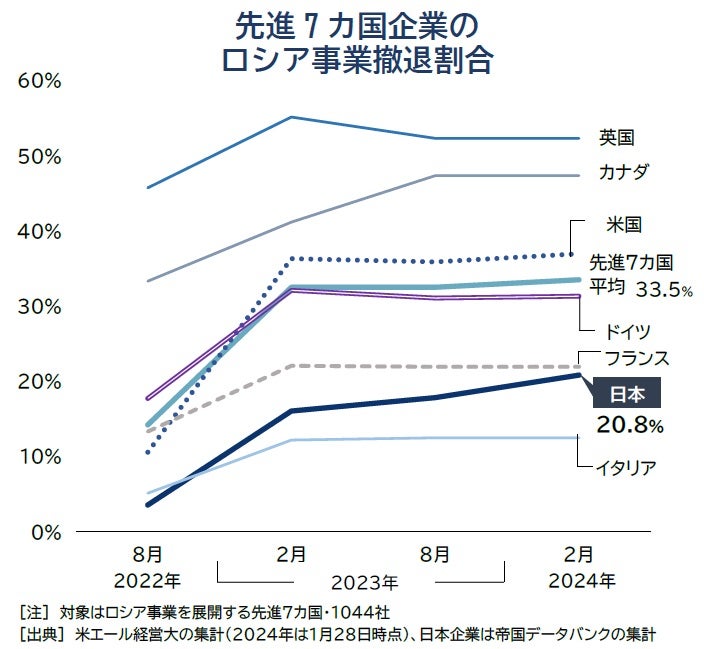 ただ、G7における事業撤退割合の平均は33.5%にとどまり、欧米先進諸国のグローバル企業でもロシアからの離脱が進まなかった。ロシア事業撤退の動きは過去1年間でほぼ変化がみられず、総じて膠着した状態が続いている。
