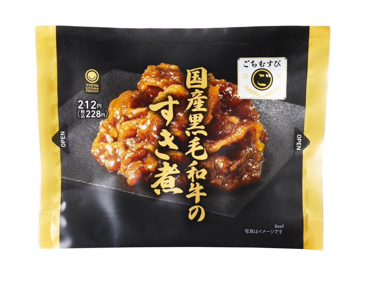 【内容】販売累計数2億食超えのおむすびシリーズ「ごちむすび」の肉系おむすびで好評の商品です。甘辛い割り下を使用して煮込んだ国産黒毛和牛を、国産コシヒカリ配合のお米、瀬戸内海産1等級海苔で包んだ贅沢なおむすびです。