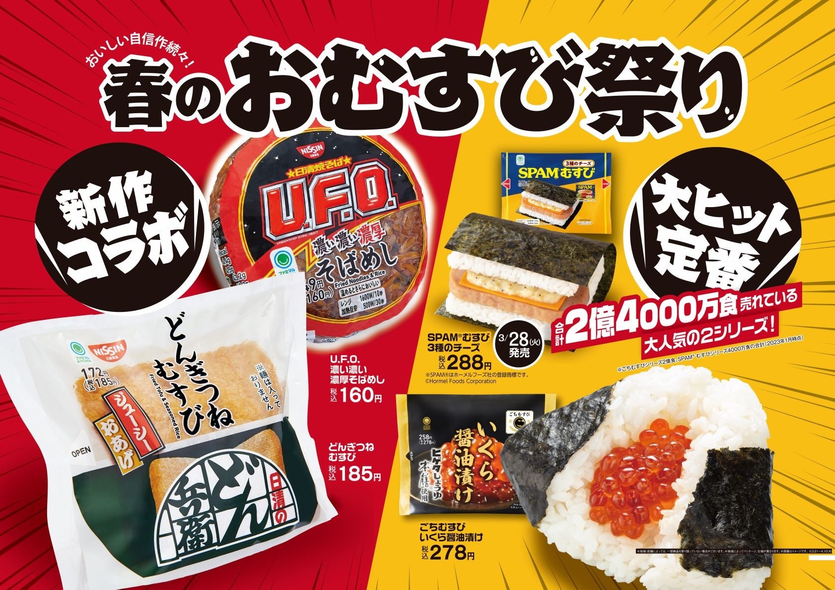 「春のおむすび祭り」の第1弾は、2022年7月発売の「U.F.O.濃い濃いモンスター焼そばパン」や、2023年2月発売の「日清焼そばU.F.O.監修 モンスター焼そばまん」で大好評をいただいた日清食品とのコラボレーション新商品として、カップ焼そば「日清焼そばU.F.O.」と、和風カップ麺「日清のどん兵衛」の味わいをイメージしたおむすびを発売いたします。
