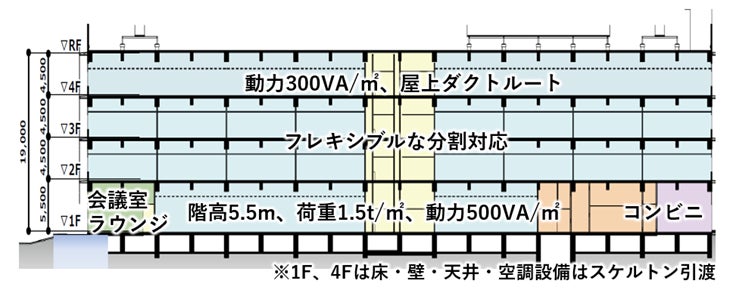 三井リンクラボシリーズは、これまでライフサイエンス領域をターゲットとして展開してきましたが、今回、工業専用地域の特性を活かして、より幅広い事業領域のお客様にもご利用いただける商品企画としております。具体には、大型機器の搬入・設置が容易に行える仕様に加え、大容量の電気供給や効率的なダクトルートの確保に対応することにより、ライフサイエンス領域はもちろん、半導体、エネルギー、食品、化学、宇宙など多様な事業領域の研究開発ニーズを包括的にサポートいたします。