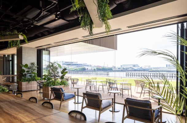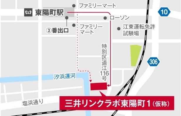 「(仮称)三井リンクラボ東陽町1」は、東京メトロ東西線「東陽町」駅より徒歩10分の場所に位置し、大手町エリアまで電車で約10分と、都心へのスムーズなアクセスを可能にします。また、汐浜運河に面した立地を活かし、水辺にテラスを設ける他、運河側からもアクセス可能な通用口を設置するなど、開放感のある設計が特徴です。