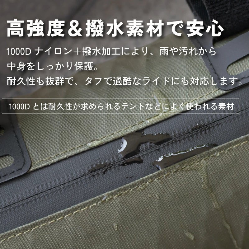 1000Dナイロン+撥水加工により、雨や汚れから中身をしっかり保護し、