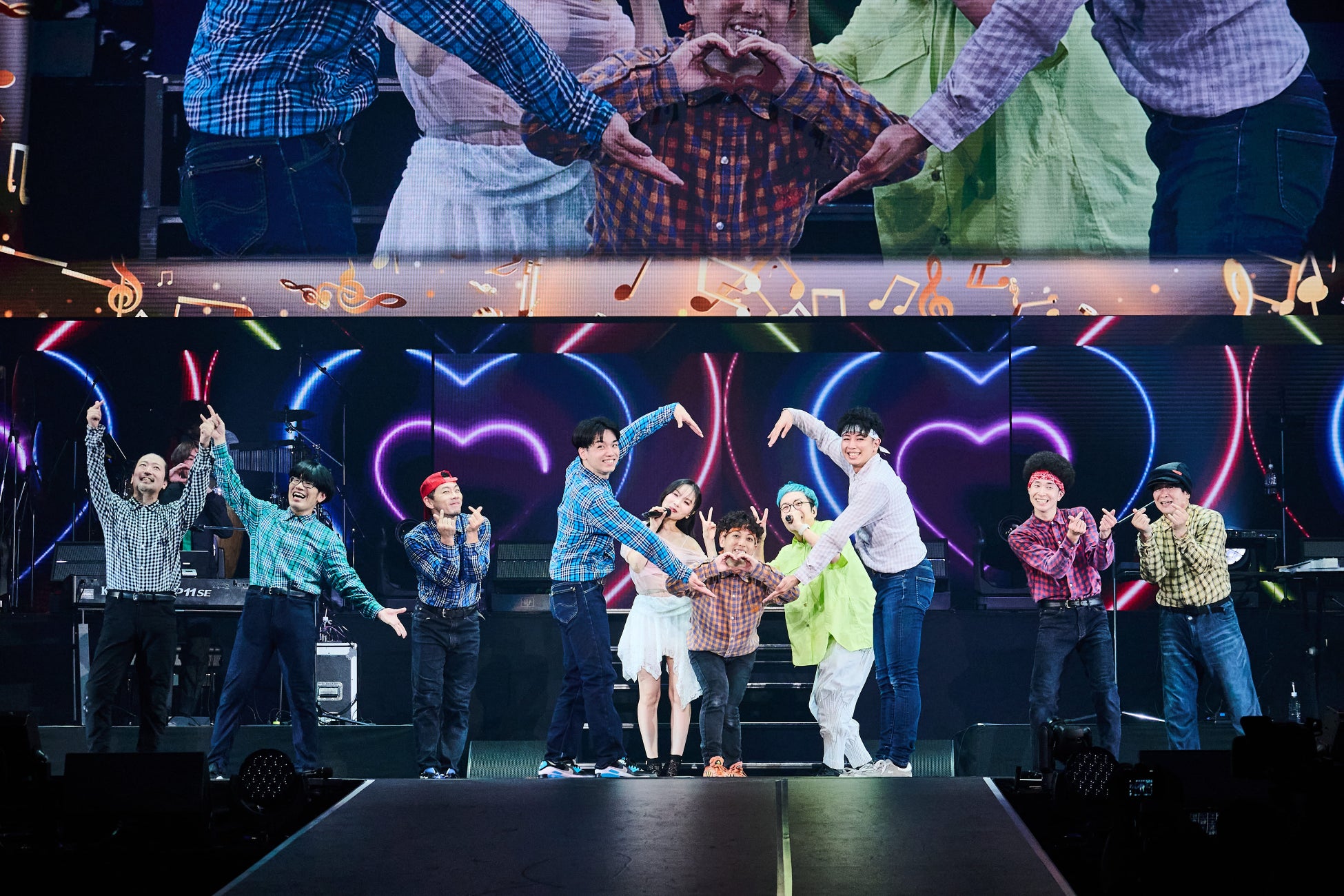 「わたくしもなぜこれをやってるかはわかりませんが」と戸惑いながら、「リアルエアーバンドボーイズです!」と挨拶した喜矢武 豊。RAB との軽快なトークで会場を盛り上げ、「我々エアーバンドなんですが、生演奏でやらせてくれるらしいんで」と『女々しくて』に突入……するはずが、なぜか楽器を放棄してステージに集まる REAL AKIBA BAND メンバーたち。「どうした? 疲れちゃった?」と戸惑う喜矢武 豊を尻目に『女々しくて』が BGM として流れ始め、出演者全員によるダンスが始まります。