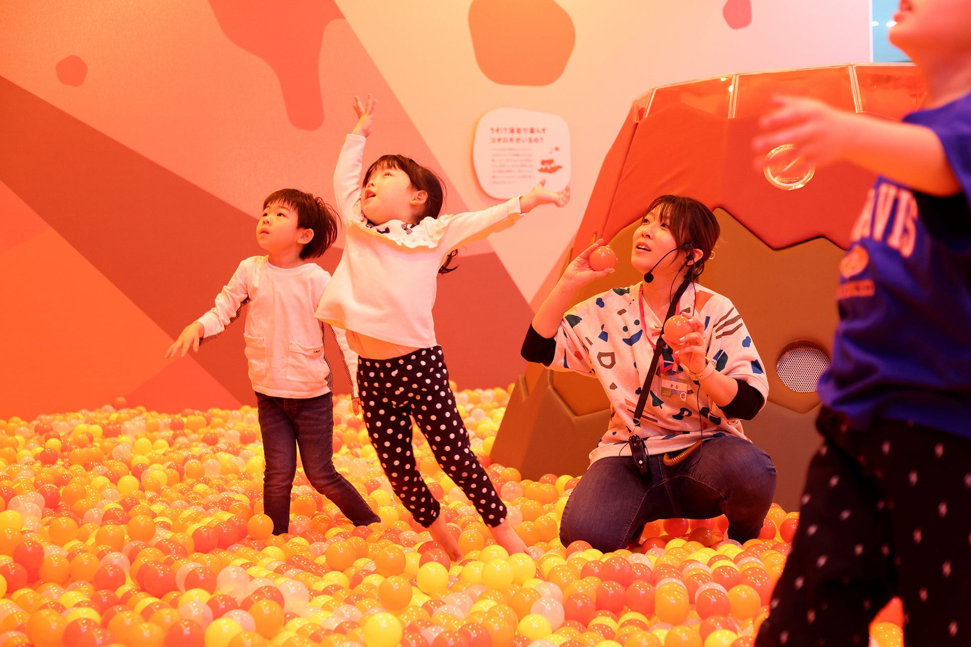 マグマが噴火する火山をイメージしたエリア。ボールが飛び出す火山や玉入れがあるボールプールで、思いっきり体を動かしてエネルギーを発散!ジャンプするのが楽しい岩をかたどったバウンサーも登場します。