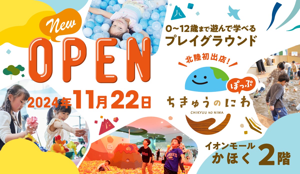 株式会社イオンファンタジー(本社:千葉県千葉市、代表取締役社長:藤原徳也、以下、当社)は、2024年11月22日(金)、石川県かほく市のイオンモールかほくに、北陸地方初・石川県初出店となるプレイグラウンド「ちきゅうのにわ‟ぽっぷ” かほく店」をオープンいたします。「ちきゅうのにわ‟ぽっぷ” かほく店」は、0歳から12歳までのお子さまとそのファミリーを対象とした、地球や自然をテーマにしたプレイグラウンドです。火山や氷山など自然をモチーフにした遊具を取りそろえ、雨の日でも雪の日でも屋内で思い切り遊ぶことができる新しい遊び場です。