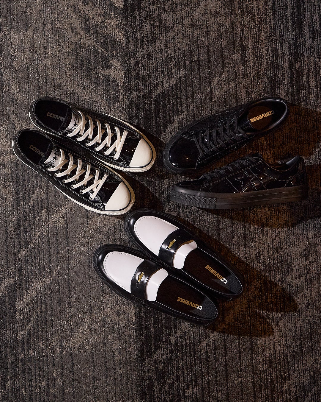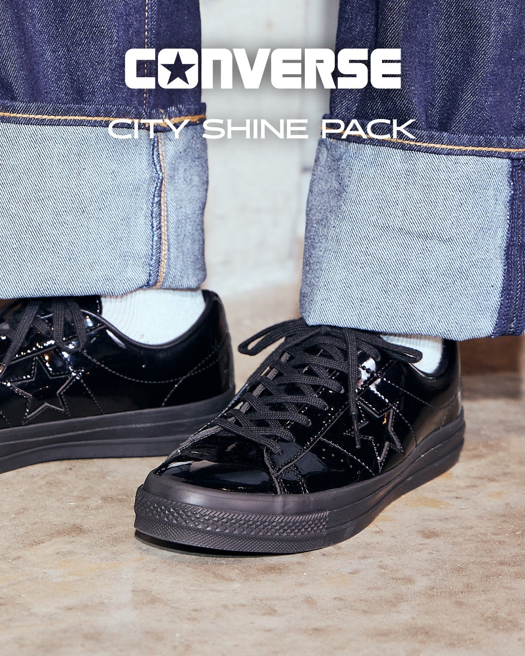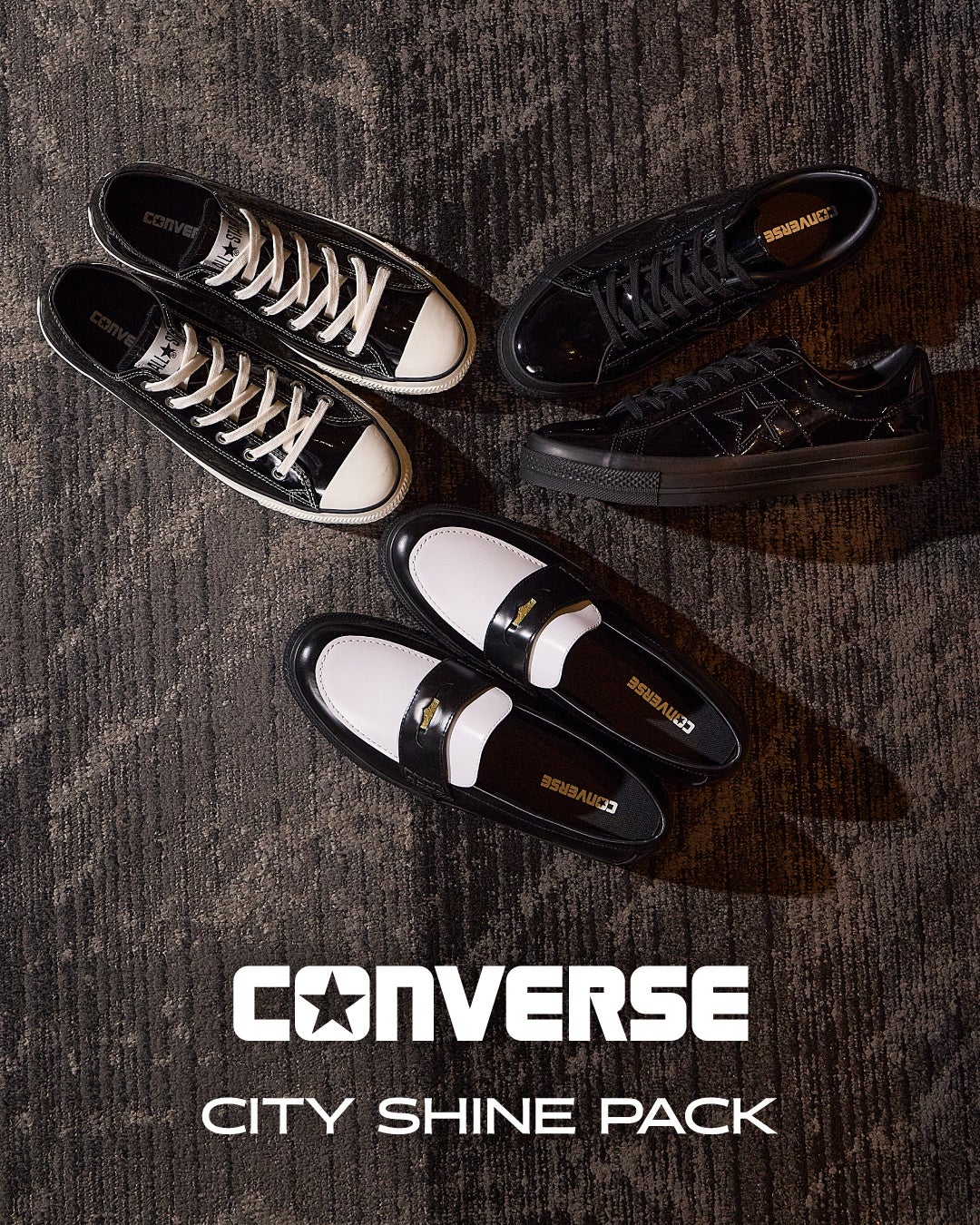 「CITY SHINE PACK」では、光沢感のあるシンセティックエナメルや、奥行きのある艶が特徴のガラスレザーなどを採用。CONVERSEを代表する「ONE STAR」や「ALL STAR」は、従来のカジュアルな印象はそのままに、さりげない艶感を加えることで、いつものスタイリングを少しだけ引き締める仕上がりに。