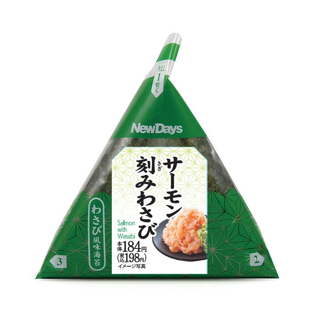 サーモンに刻みわさび入りの醤油だれを合せた、ピリッと辛味のあるわさび風味海苔のおにぎりです。