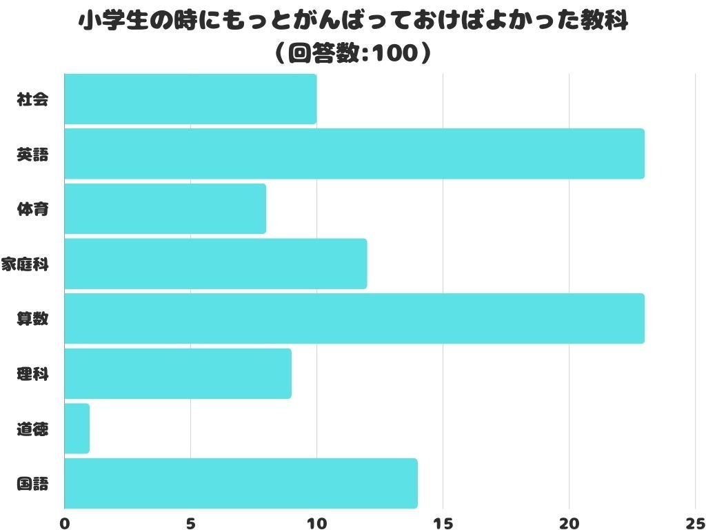 小学生の時にもっとがんばっておけばよかった教科をアンケートにて調査したところ、1位は「英語」「算数」でした。