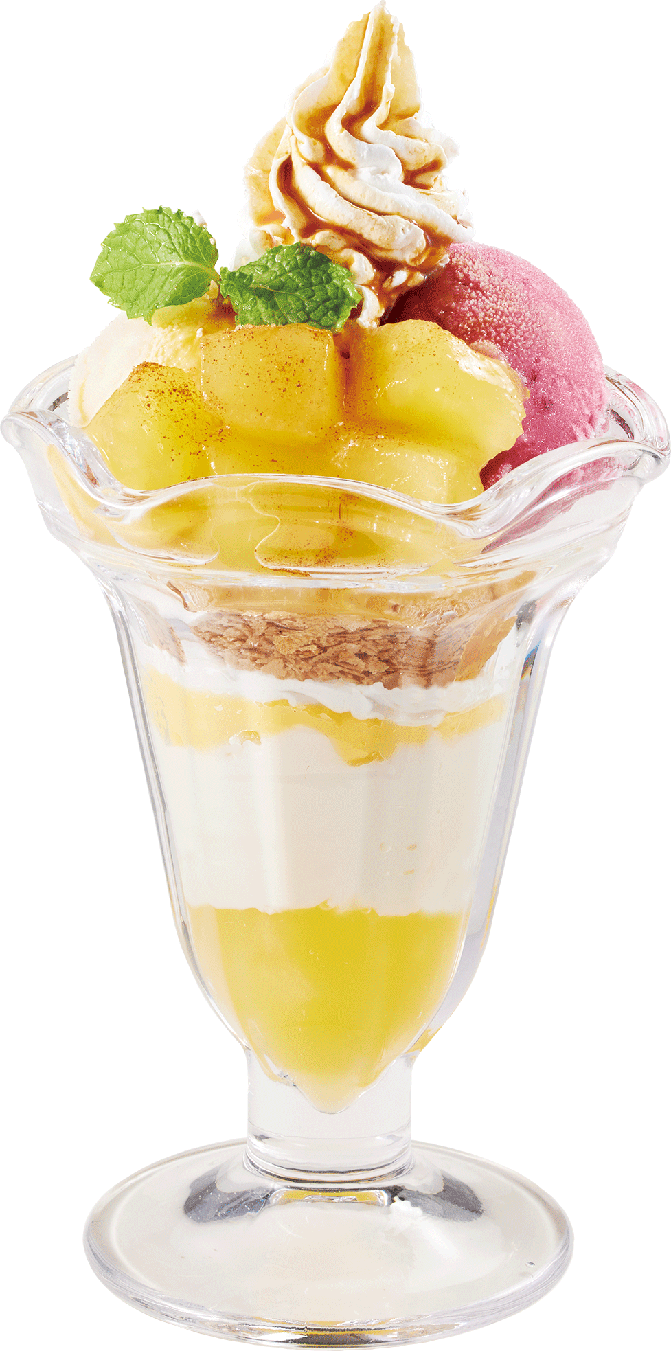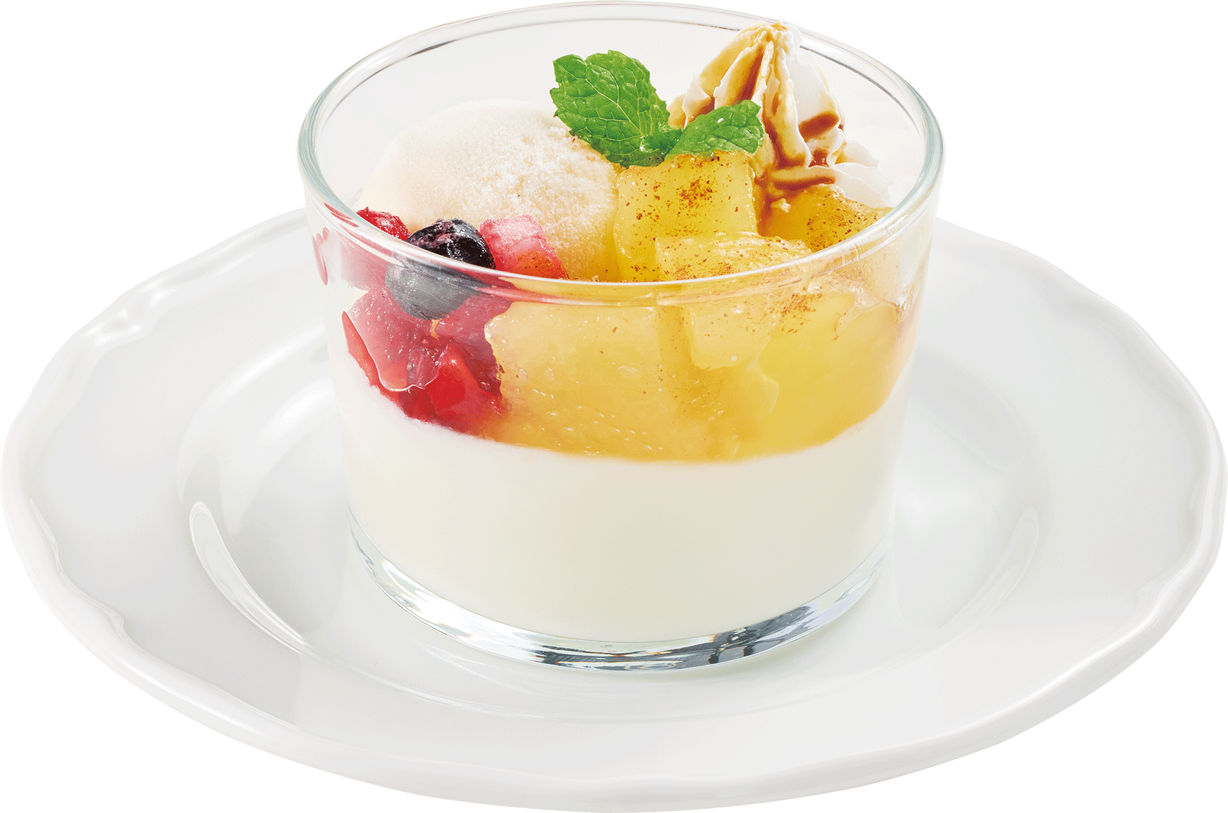 たっぷりの角切りリンゴのシロップ漬けと2種類のジェラート(バニラと4種のミックスベリー)、ホイップやカスタードなどをつかったパフェです。爽やかな酸味の4種のミックスベリージェラートは、リンゴのやさしい甘さを引き立てます。角切りリンゴのシロップ漬け、なめらかなパンナコッタ、サクサククレープなど、食感も楽しい一品に仕上げました。最後までリンゴたっぷりの季節限定ドルチェをご堪能ください。