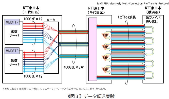 (※5)「MMCFTP」:ビッグデータを転送する際は同時に多くのTCPコネクションを使用することが特徴。MMCFTPは遅延の大きさやパケットロス率などのネットワークの状況に応じてTCPコネクション数を動的に調整することで、安定した超高速データ転送を実現するファイル転送プロトコル。マルチパス転送(複数の経路を同時に使って一つのデータ(ファイル)を転送する)に対応しており、本実験では12パス同時転送を行った。