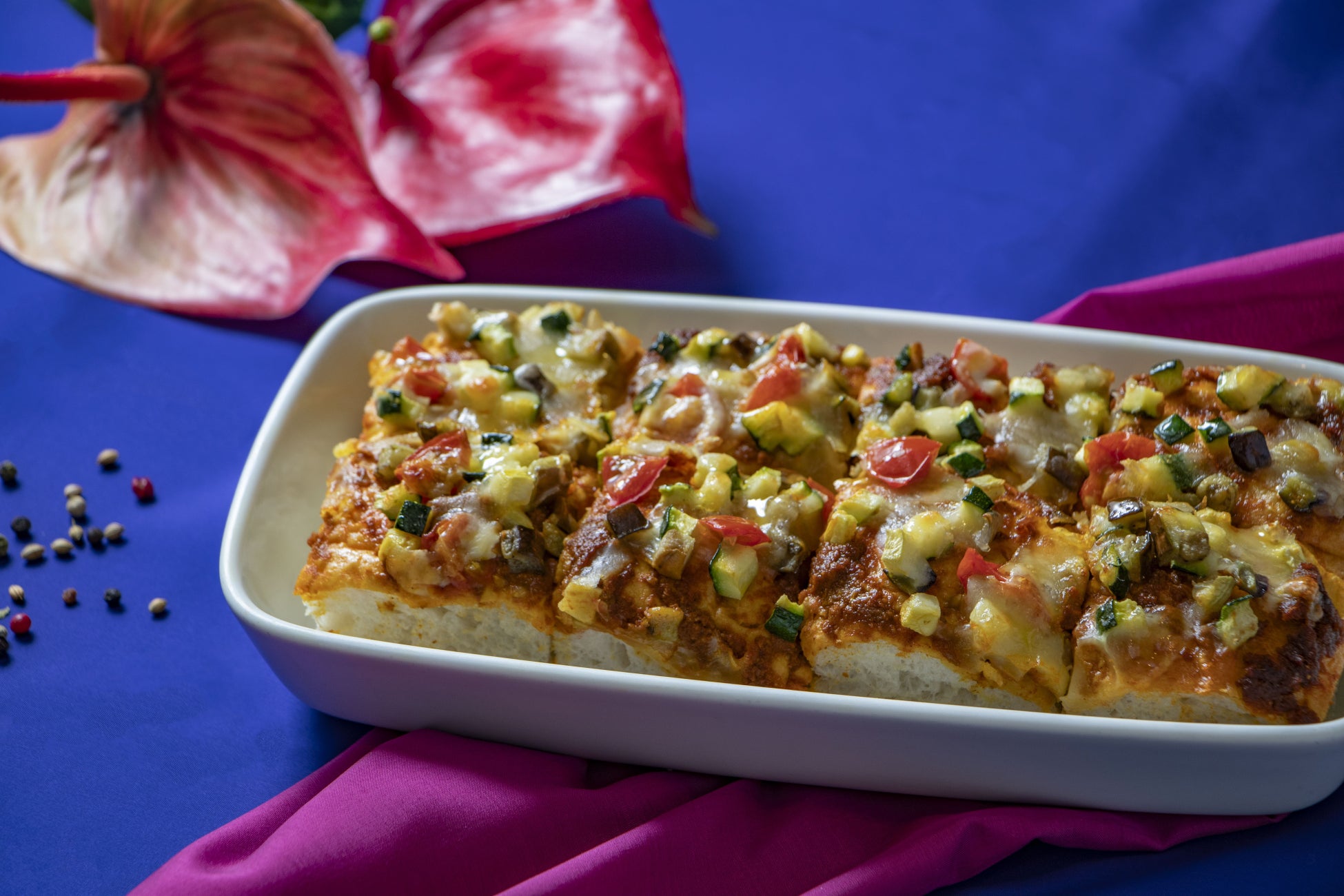 ふかふかもちもちフォカッチャに、スパイシーな特製カレーソースと夏野菜をたっぷり乗せて焼き上げました!