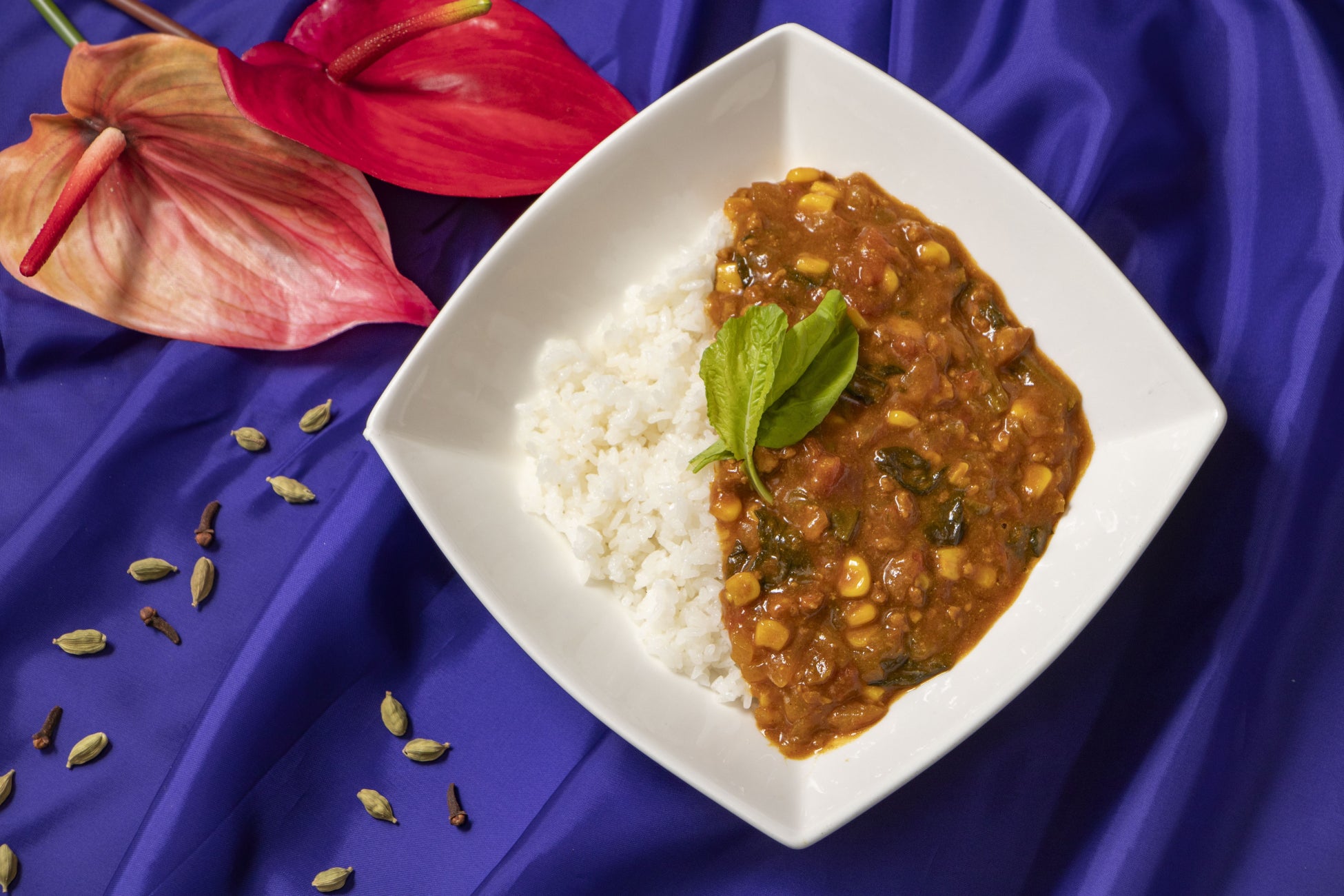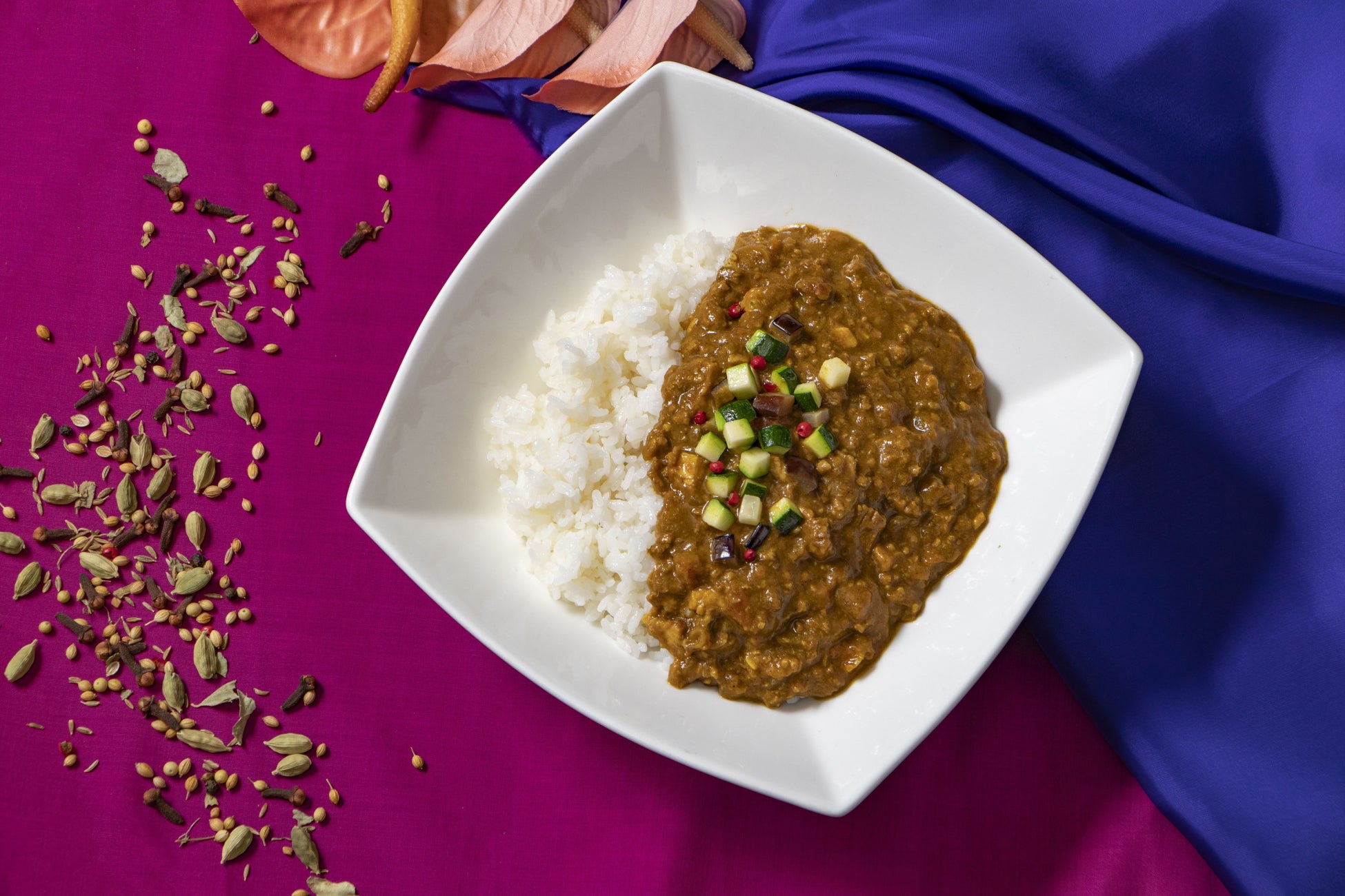 札幌発祥で人気のスープカレーを再現し、地元の野菜などを蒸籠で蒸したスパイシーでありながらスプーンが止まらないカレー。