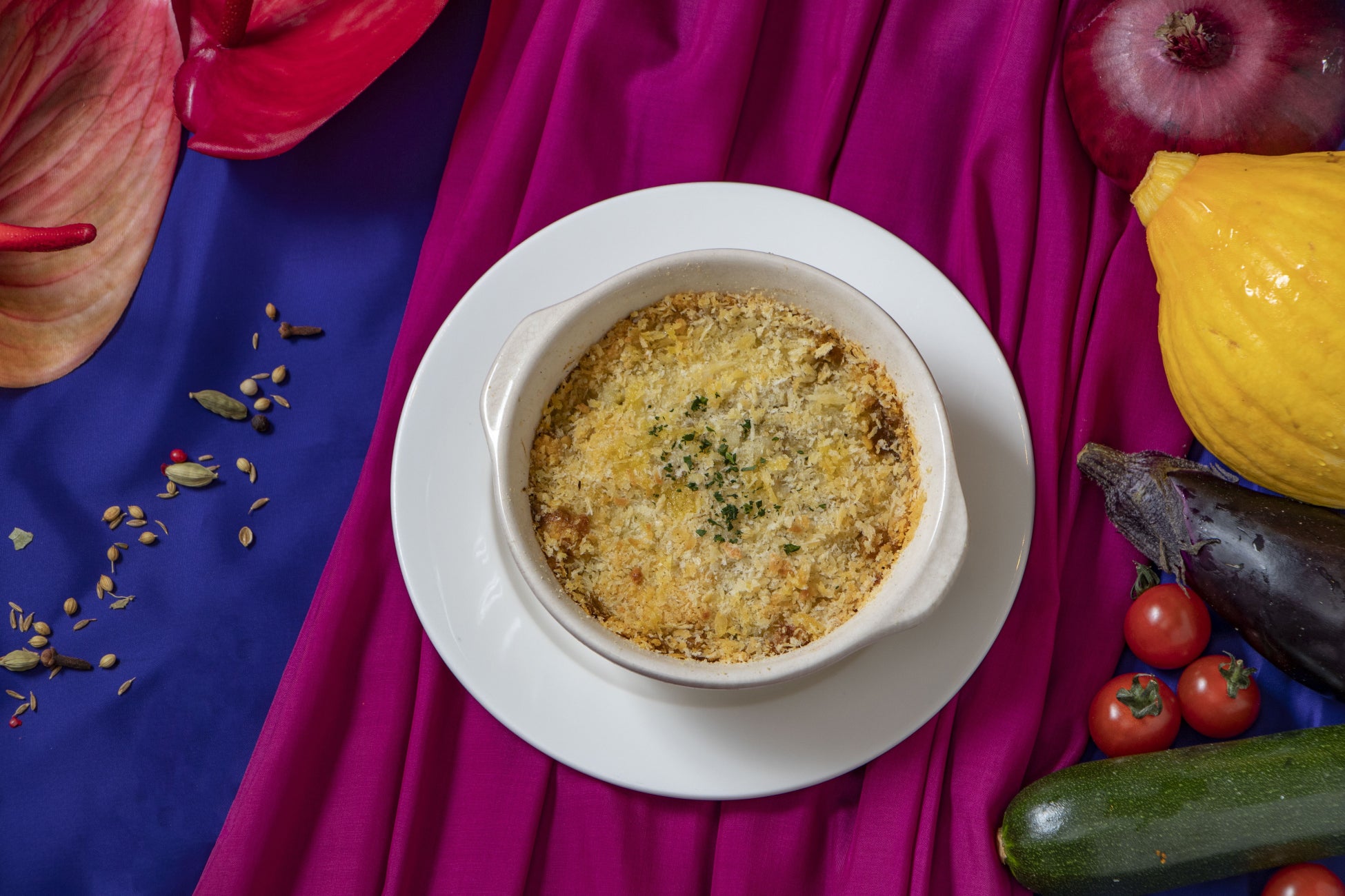 オーブンで焼くことによる食感の楽しさ、カレーソースとチーズがとろけて絡み合い香ばしい表面がそそります。