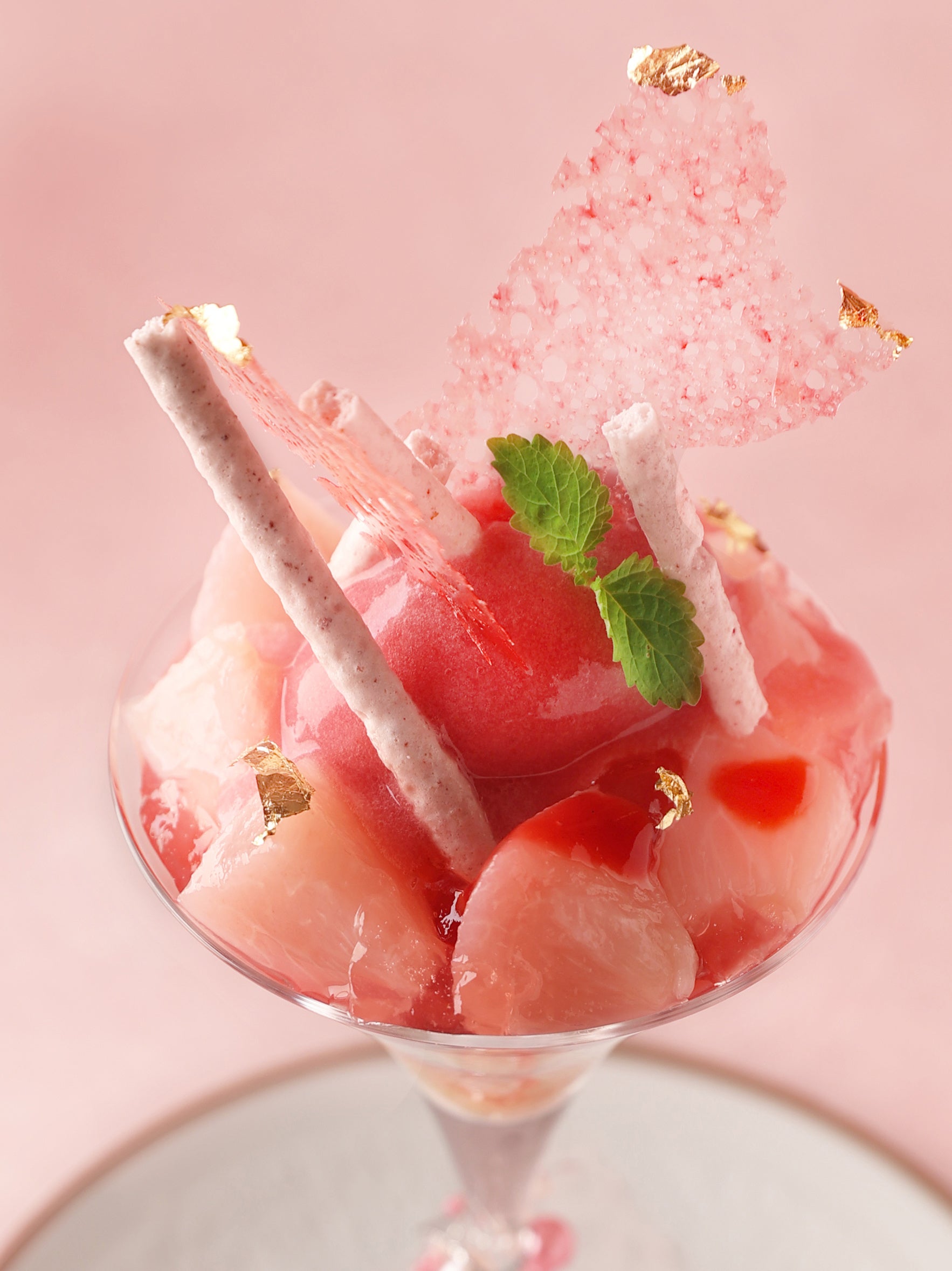 「桃のパフェ ヴェルヴェーヌの香りをアクセントに」は桃1玉分をフレッシュ、コンポート、ソルベでお楽しみいただけます。