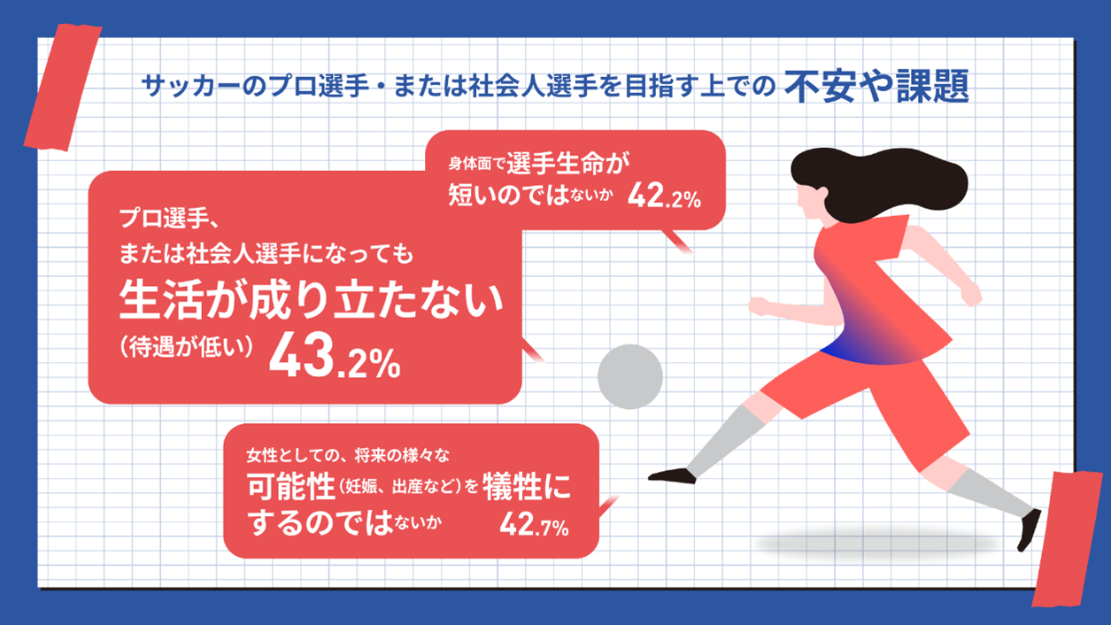 | 1. 女性プレーヤーの7割以上が機会・環境・ステップアップ面ともに男女差を感じる 2. 女性だからこその悩み・困りごとに「スポーツにおける体型の変化」や「周囲の理解」が上位に 3. プロ選手・社会人選手を目指す上で「女性としての将来の可能性を犠牲にする」を課題や不安に感じているプレーヤーが4割以上 4. 約2人に1人が今後幼い子でもサッカーチャレンジできる機会がどの町にでもあって欲しいと回答 |