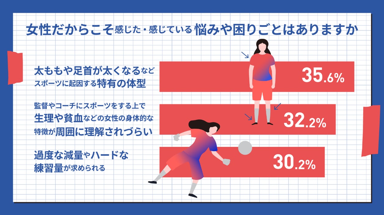またスポーツプレーヤーとして、“女性”だからこそ感じる悩みや困りごとがあるかという質問に対して、「太ももや足首が太くなるなどスポーツに起因する特有の体型(35.6%)」と回答するプレーヤーが最も多く、次いで「監督やコーチにスポーツをする上で生理や貧血などの女性の身体的な特徴が周囲に理解されづらい(32.2%)」、「過度な減量やハードな練習量が求められる(30.2%)」という結果になりました。上位項目のうち、スポーツによる体格・体型の変化への悩みに加えて、周囲の理解に関する項目も悩み・困りごととして挙げられていることが伺えます。