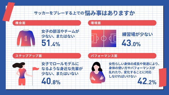 さらにサッカーをプレーする中での悩みについて、「機会面」「環境面」「ステップアップ面」「パフォーマンス面」でそれぞれ具体的に伺いました。機会面では「女子の部活やチームが少ない、またはない(51.4%)」、環境面では「練習場所が少ない(43.0%)」、ステップアップ面では「女子でロールモデルになるような身近な先輩が少ない、またはいない(40.8%)」、パフォーマンス面では「女性らしい身体の成長や発達により、身体の使い方やパフォーマンスが乱れたり、変化することに対応しなければいけない(42.2%)」が最も大きな悩みとしてあげられました。男女の体格差に起因するパフォーマンスだけでないところにも多くの女性プレーヤーが男女差を感じていることが分かりました。