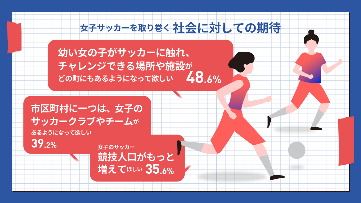 「女子サッカーを取り巻く社会に対しての期待をお知らせください」という質問に対して、「幼い女の子がサッカーに触れ、チャレンジできる場所や施設がどの町にもあるようになって欲しい(48.6%)」と半数以上が回答。次いで「市区町村に一つは、女子のサッカークラブやチームがあるようになって欲しい(39.2%)」、「女子のサッカー競技人口がもっと増えてほしい(35.6%)」と、多くの女子サッカープレーヤーが今後の女子サッカーに対して期待を寄せていることが分かりました。