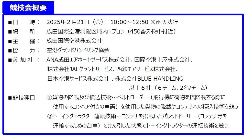 今回の競技会には、過去最多となる6社が参加し、日々成田空港の安全運航を支える地上作業(ランプハンドリング業務)を担うスタッフが、日頃の業務で培った技術やノウハウを披露します。また、当日は将来のランプハンドリング担い手となる航空専門学校や大学の学生を招待し、プロの技術を間近で見学いただき、一般の方に向けては、YouTubeを活用したライブ配信を実施いたします。