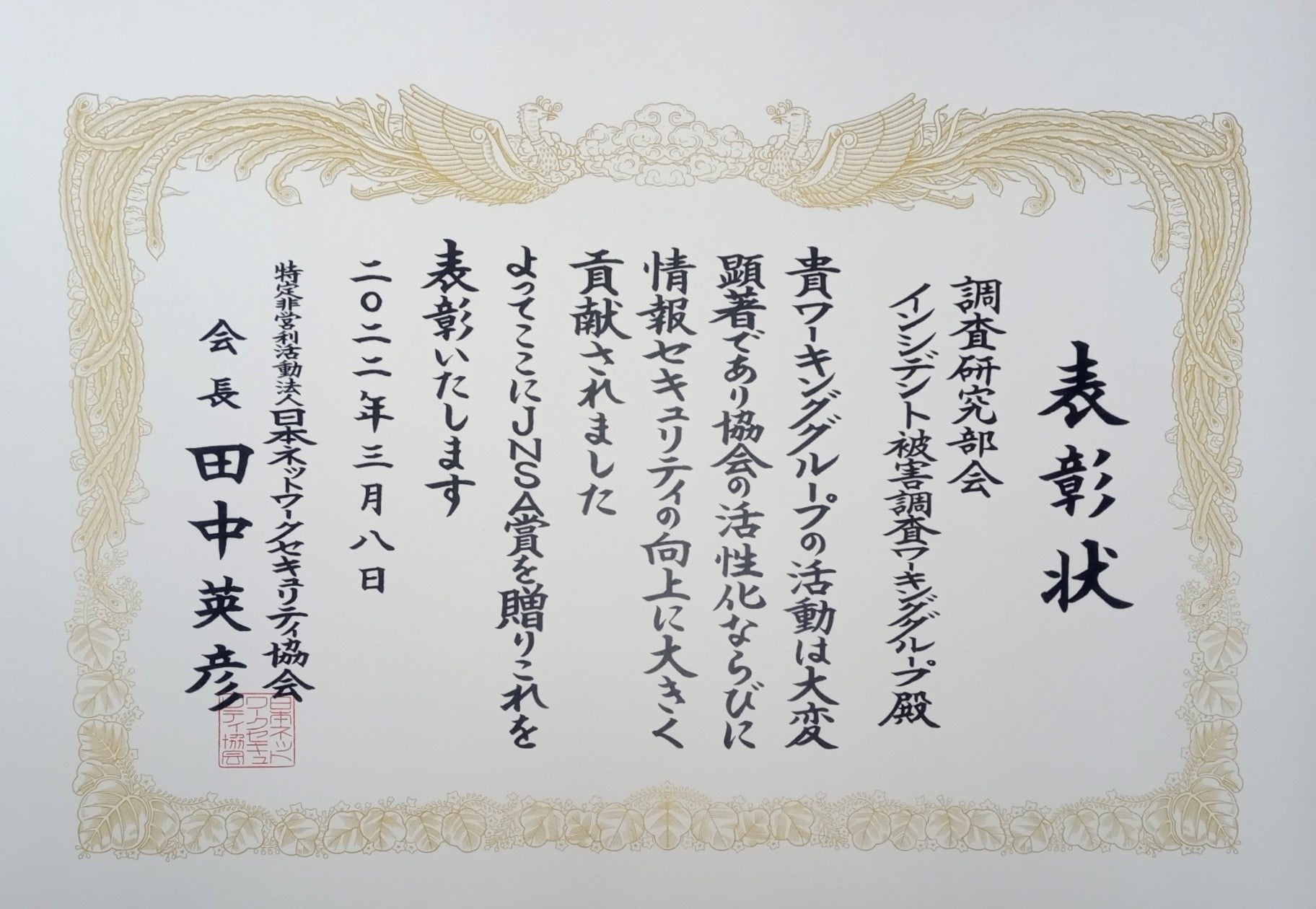 特定非営利活動法人 日本ネットワークセキュリティ協会(JNSA)が主催する「2021年度JNSA表彰」において、キヤノンマーケティングジャパングループのキヤノンITソリューションズ株式会社(代表取締役社長:金澤 明、以下キヤノンITS)社員がサブリーダーとして参加している「インシデント被害調査ワーキンググループ」が、「JNSA賞」を受賞しました。