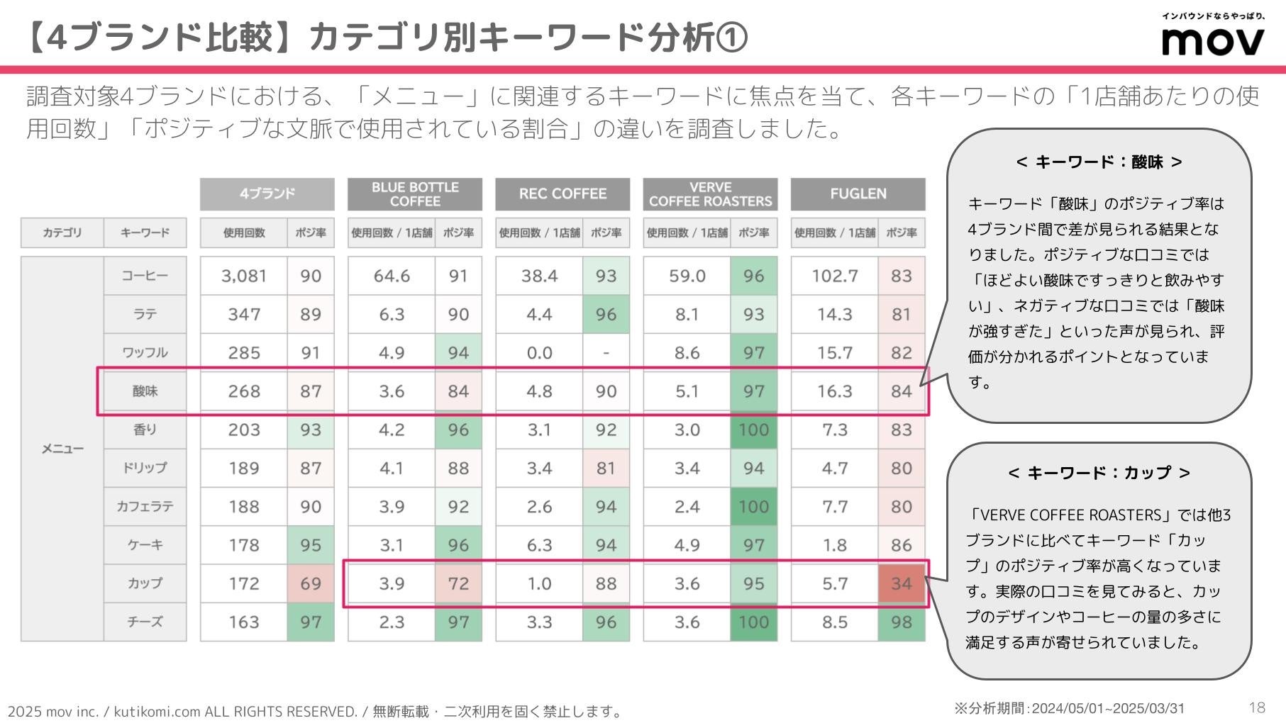 こちらの表では、「FUGLEN」の口コミにおける、キーワードの「使用回数」「ポジティブな文脈で使用されている割合(ポジティブ率)」を算出し、「使用回数」「ポジティブ率」「ネガティブ率」ごとにランキング形式で分析しています。