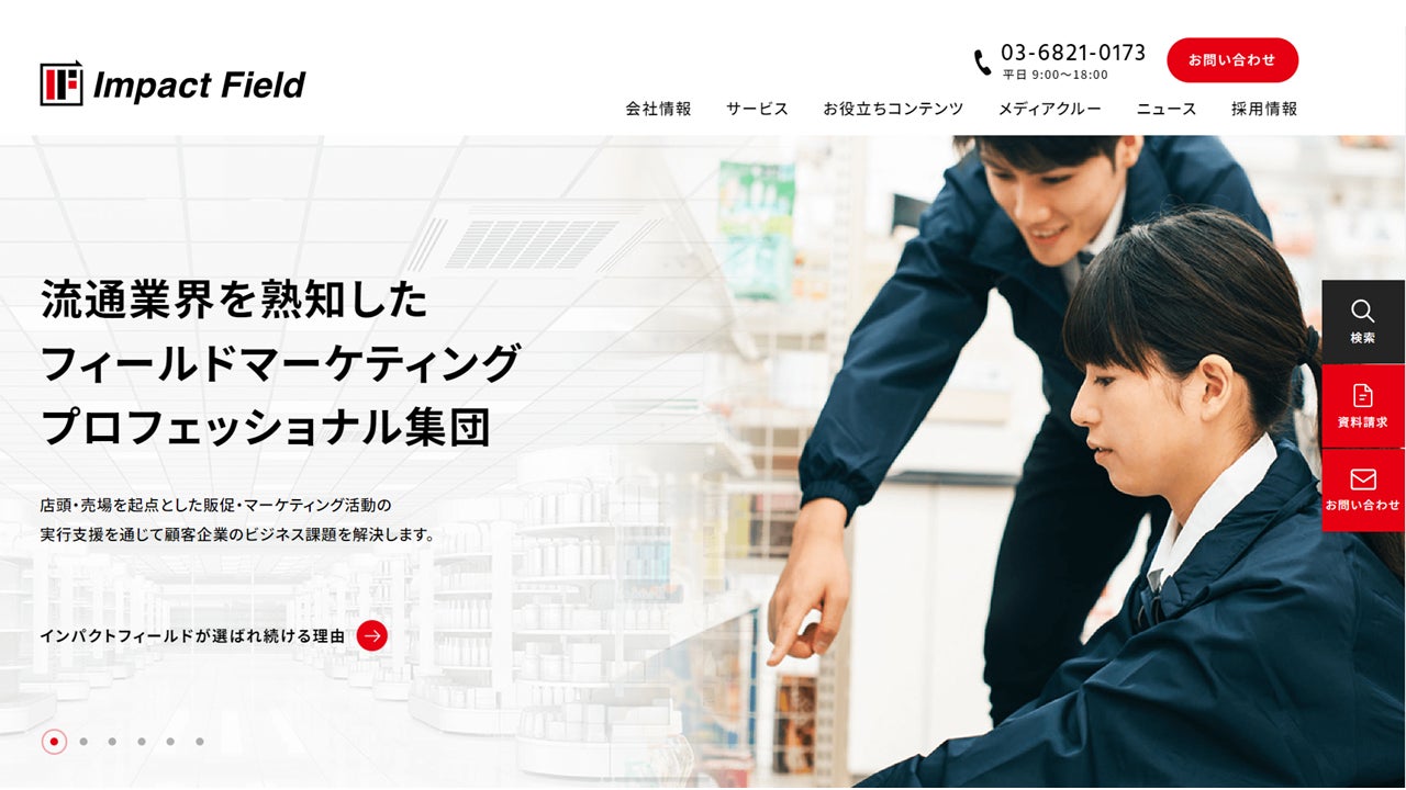 インパクトホールディングス株式会社 (以下 「インパクトHD」) の連結子会社で、ラウンダーや販売員派遣を中心としたフィールドマーケティング事業を展開するインパクトフィールド株式会社 (本社:東京都渋谷区、代表取締役社長:野口 将和、以下 「当社」) は、コーポレートサイトを全面リニューアルしたことをお知らせいたします。 今回リニューアルしたコーポレートサイト ( https://field.impact-h.co.jp/ ) では、サービス・ソリューションのラインナップの拡充、お役立ちコンテンツ、資料請求などのページコンテンツを新たに追加いたしました。