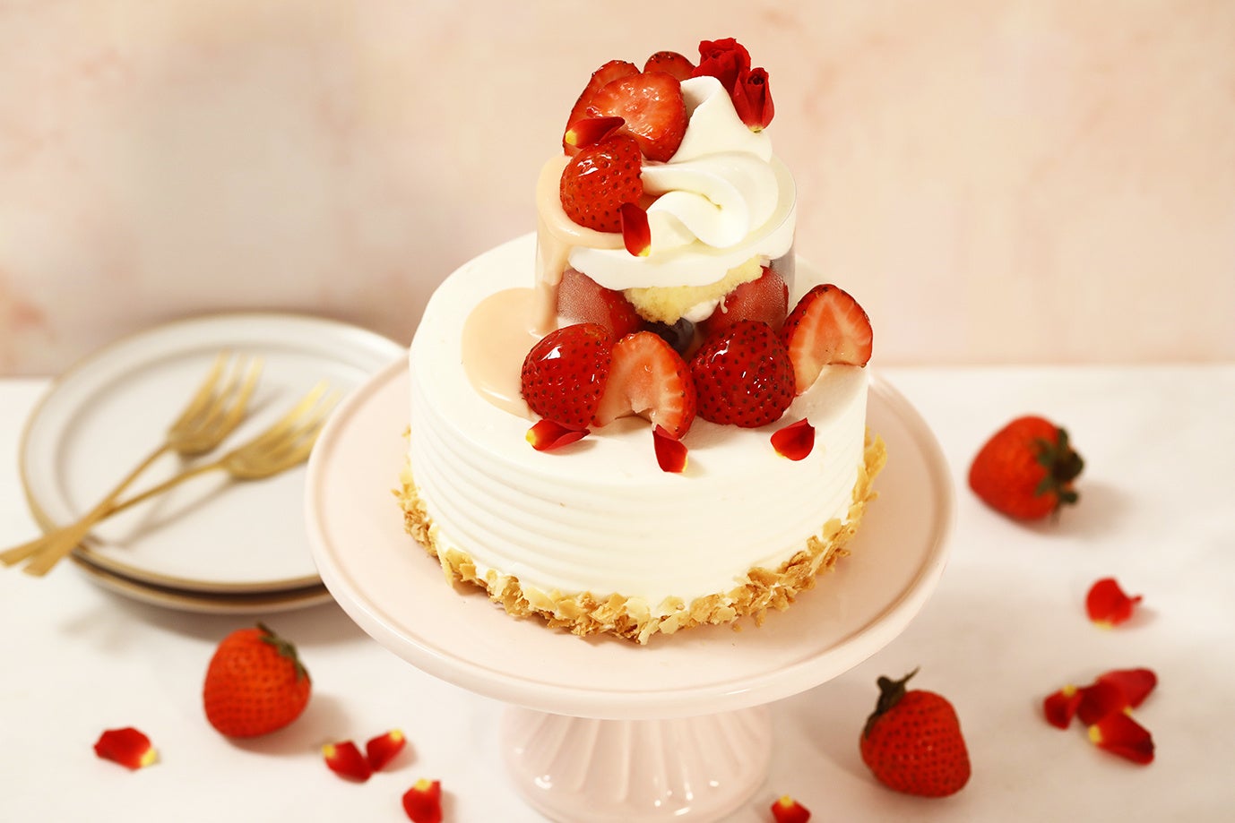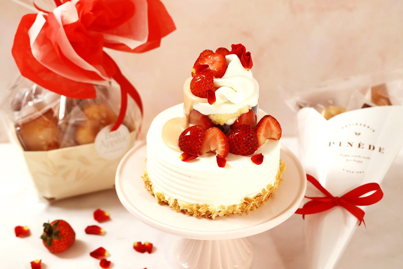 こだわり:ふわふわのスポンジと優しい味わいのホイップクリームが特徴の『ピネードデコレーションケーキ』に7cmのケーキを重ね、苺、グラサージュ、ベルローズで仕上げた華やかな2段ケーキです。2人の時間や家族の団らんを大切にする特別な日に合わせて、サイズ感やビジュアルにもこだわりました。