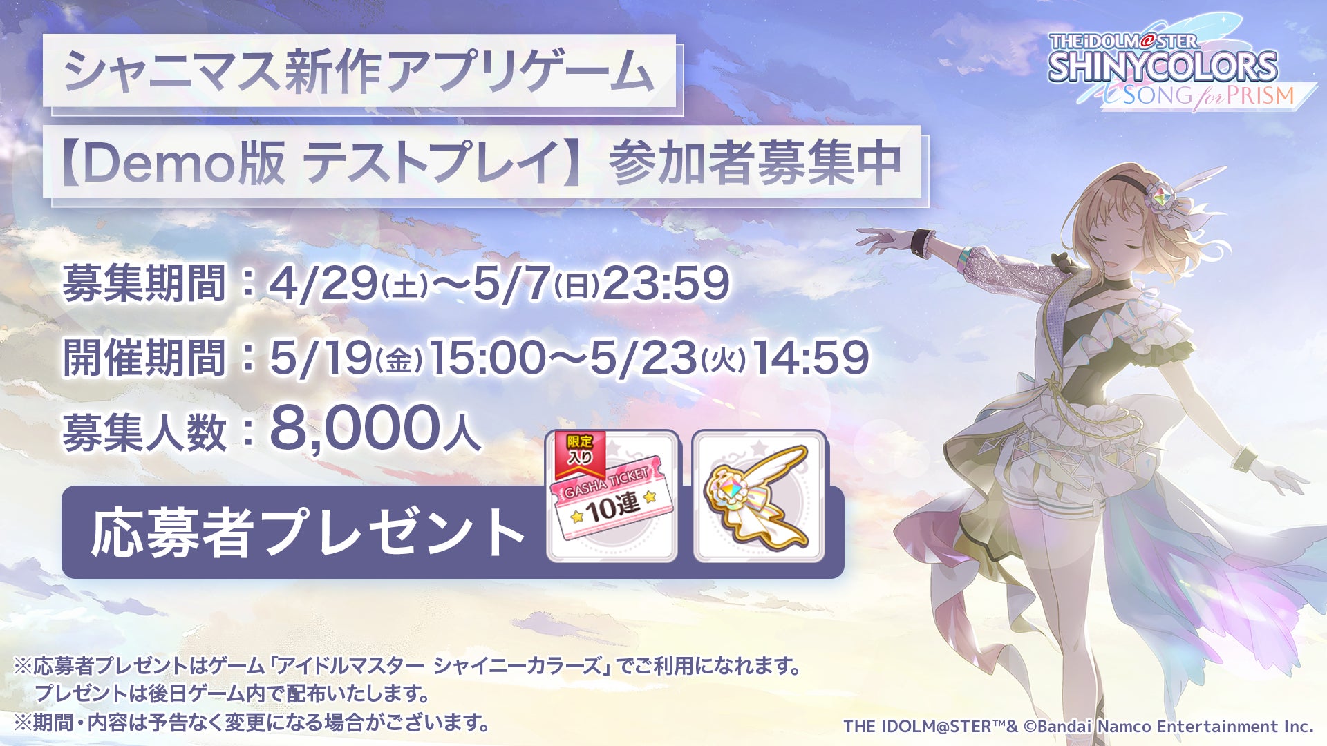 『アイドルマスター シャイニーカラーズ Song for Prism』の「Demo版 テストプレイ」の実施も決定!参加者募集開始!
