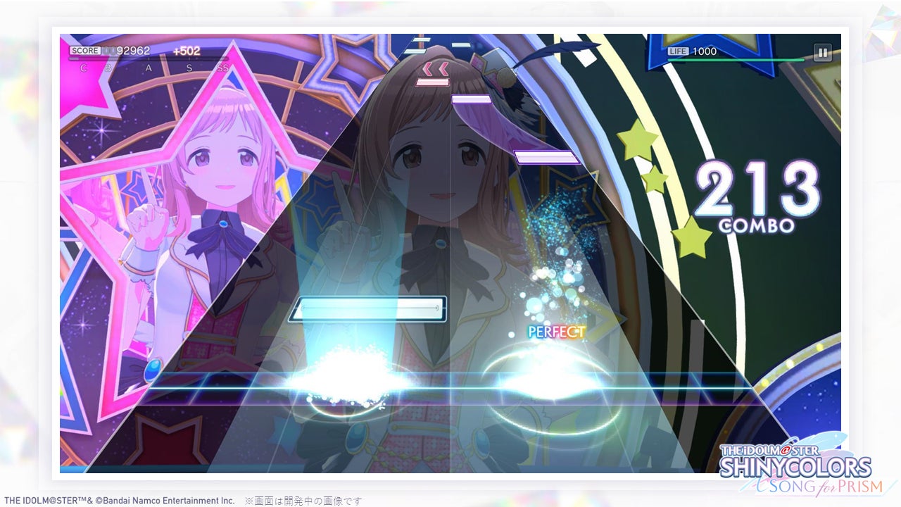 リズムゲームパートでは、育成したアイドルたちを編成し、シャニマスのさまざまな楽曲でリズムゲームをプレイすることが可能です!