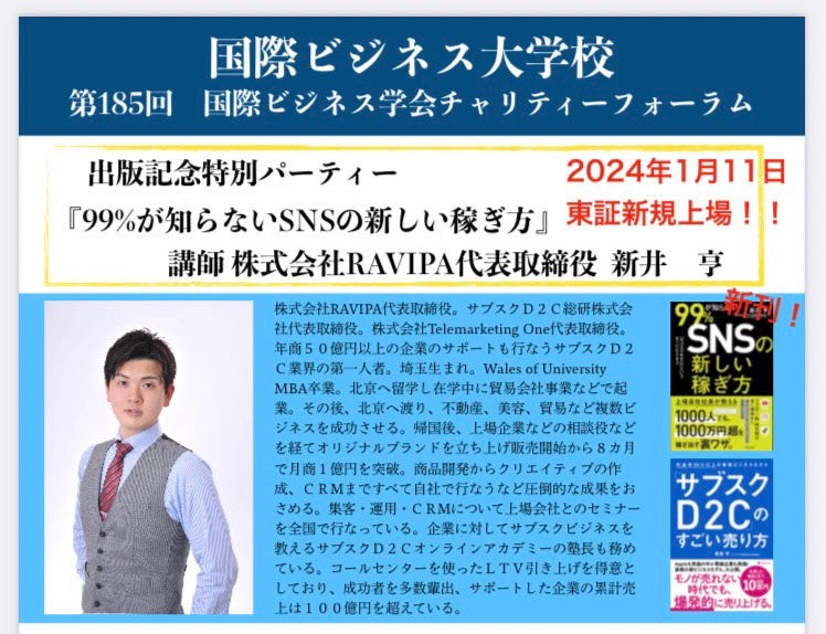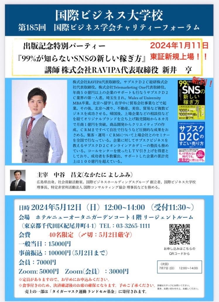 【サブスクP2C通販の書籍】「2024年5月国際ビジネス学会チャリティフォーラム」がホテルニューオータニにて開催されます|出版記念パーティー