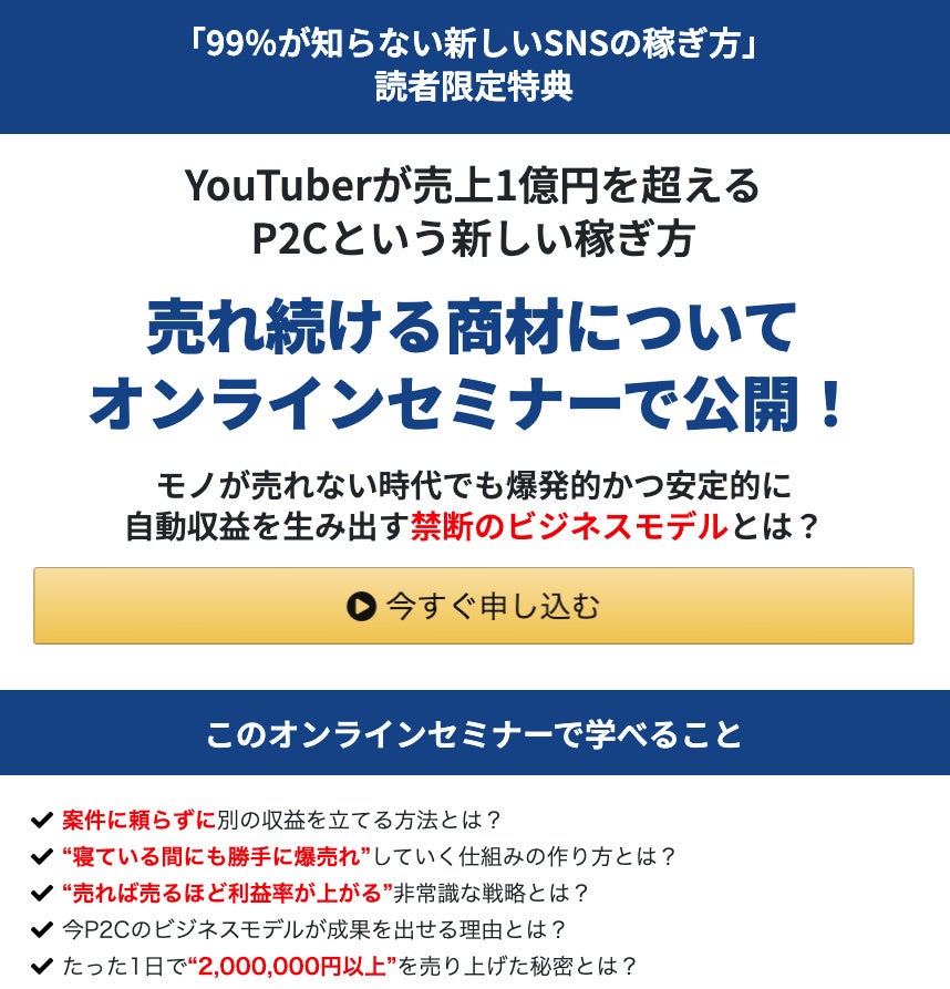 99%知らないSNSの新しい稼ぎ方の特典ページとして サブスクP2Cのビジネスモデルのウェブセミナーを開催しています。