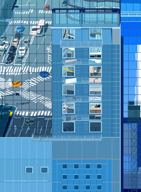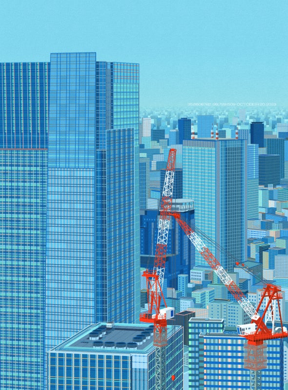 「一見すると雑多でカオスな印象がある東京も、見方や切り取り方を変えれば、何気ない日常の中に美しさを見出すことができる」と語り、見たままではなく、自身のフィルターを通して切り取ることで、実際の色のトーンとは違ったあたたかみのある作品を描いています。全てのイラストにはその地点の緯度・経度座標を描き入れており、それはイラストで切り抜かれたシーンを実際に見てほしいという思いと、紙面の余白内に句読点を打つ意味合いを持ちます。