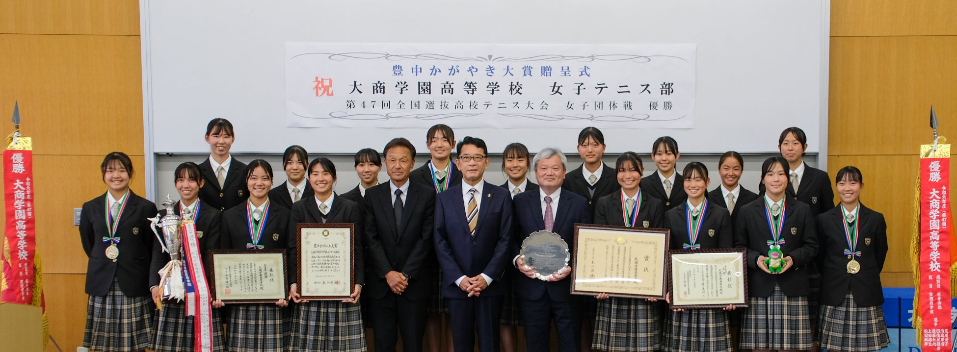 令和7年(2025年)3月21日~25日に開催された第47回全国選抜高校テニス大会女子団体戦において、大商学園高等学校女子テニス部が優勝しました。(昨年は準優勝)