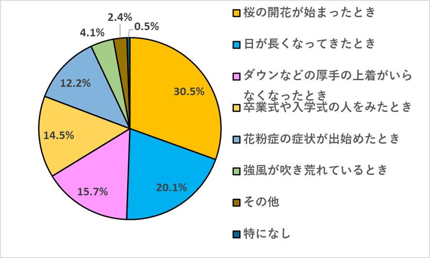 「どんなときに春を感じますか?」という質問を複数回答可で行ったところ、「桜の開花が始まったとき」が30.5%、次いで「日が長くなってきたとき」が20.1%、「ダウンなどの厚手の上着がいらなくなったとき」が15.7%という順になりました。