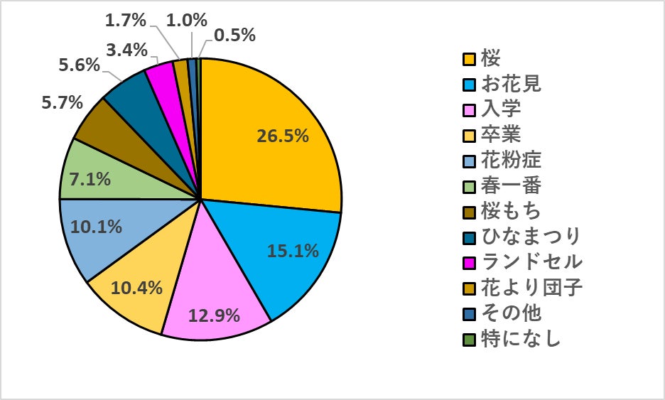 「春といえばどのような言葉を連想しますか?」という質問を複数回答可で行ったところ、「桜」が26.5%、「お花見」が15.1%、「入学」が12.9%という順になりました。桜やお花見などを連想する方が多いようですね。