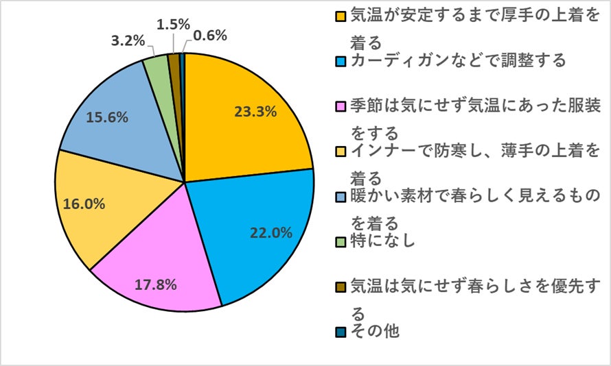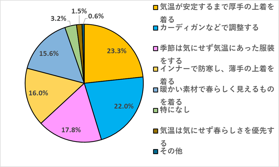 - 春の服装は、「気温が安定するまで厚手の上着を着る」が最多