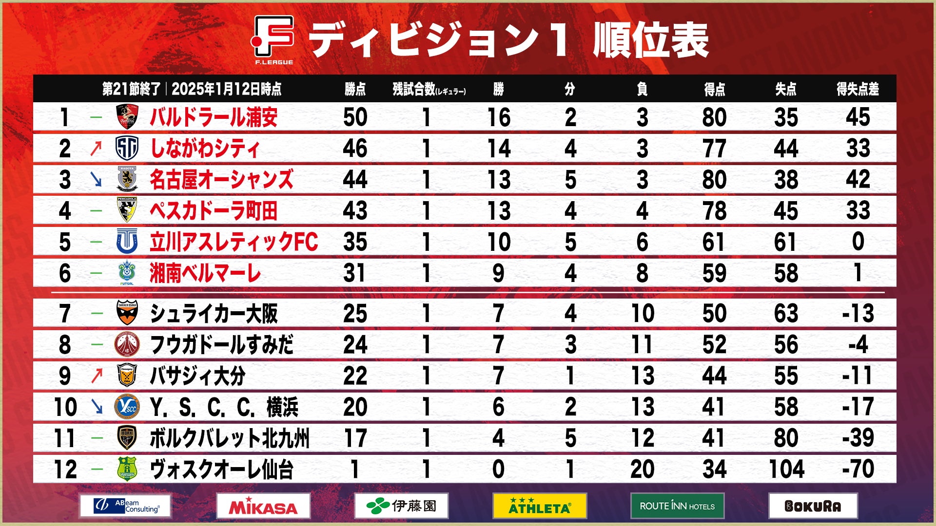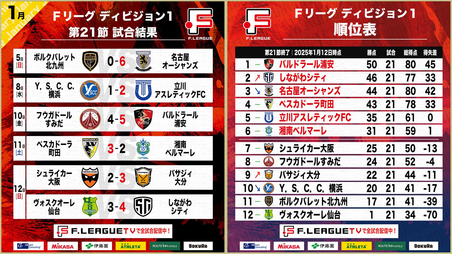 2025年1月5日(水)〜12日(日)に実施したFリーグ2024-2025 ディビジョン1 第21節の6試合について結果をお知らせいたします。