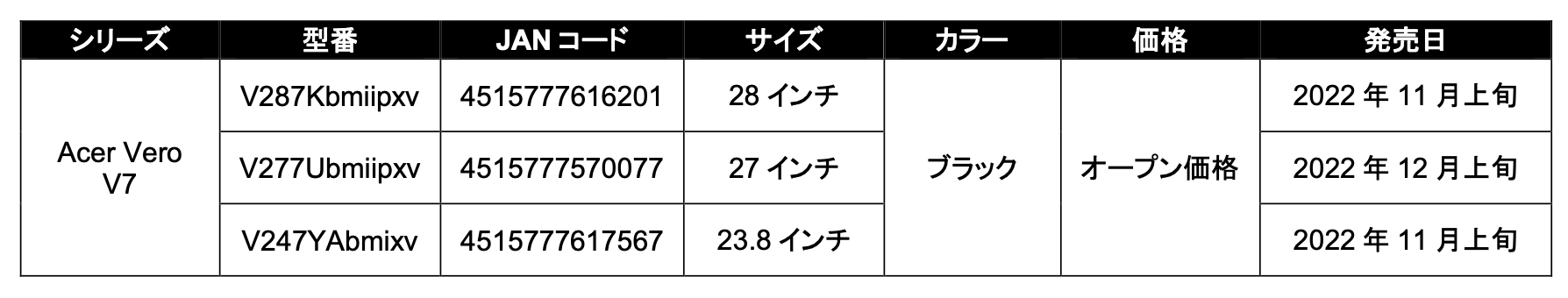日本エイサー株式会社(本社:東京都新宿区、代表取締役社長:ボブ・セン)は、Acerの統合的なサステナビリティに考慮した取り組みを具現化するサステナブルな製品シリーズAcer Vero(ヴェロ)より、法人市場向けモニター 3機種「V287Kbmiipxv」「V277Ubmiipxv」「V247YAbmixv」を発売します。「V287Kbmiipxv」「V247YAbmixv」は11月上旬、「V277Ubmiipxv」は12月上旬発売予定です。