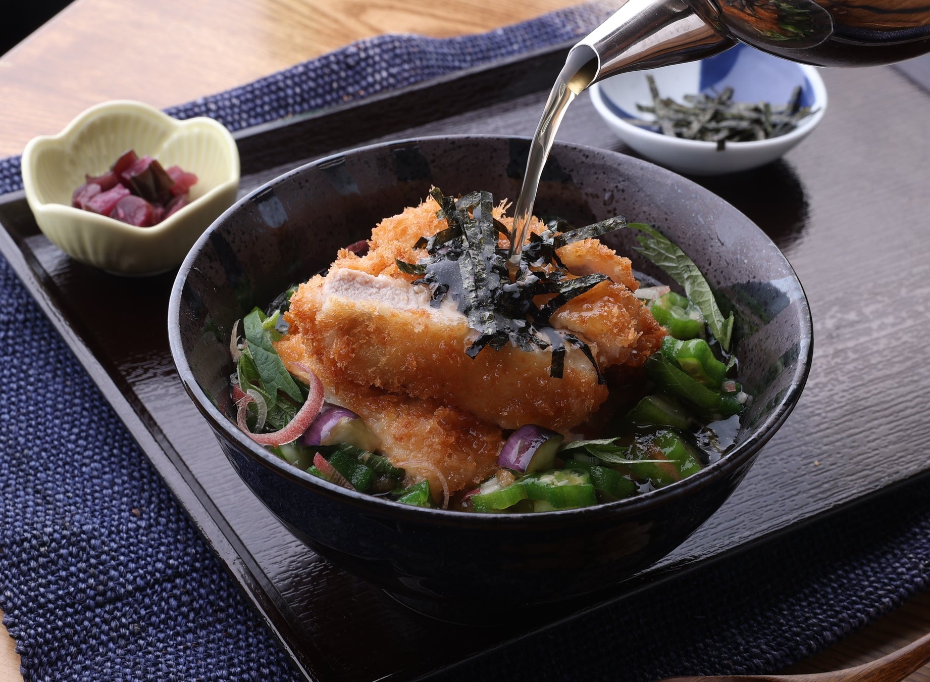 熱々揚げたてのとんかつ丸ごと1枚に、冷たい出汁をかけてさっぱりと味わう、食べ応え抜群な『冷やし とんかつ出汁茶漬け』をランチ限定でご提供しております。