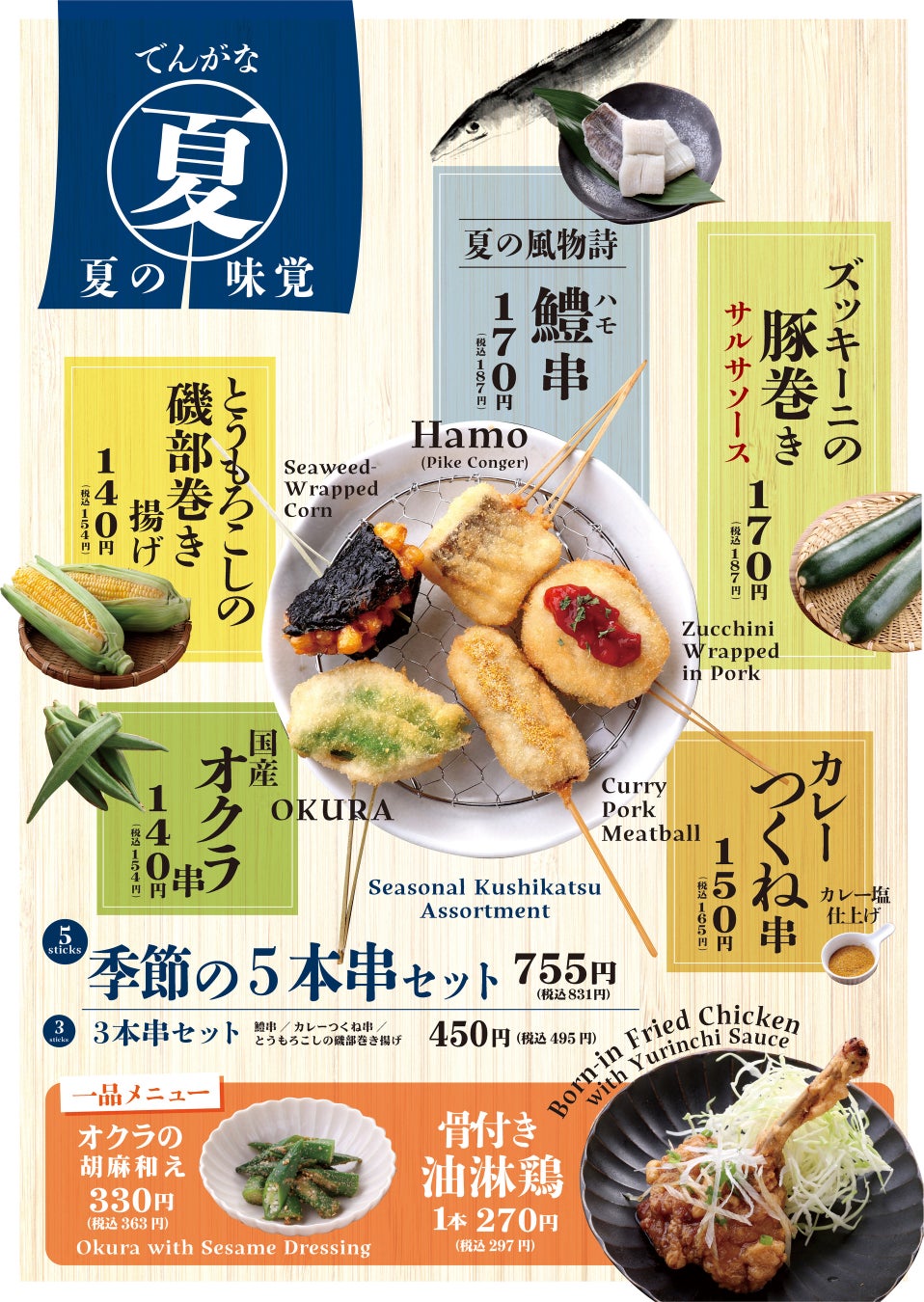 「串かつ でんがな」で夏の味覚を満喫!!新作のとうもろこしやズッキーニ、大人気の鱧など旬の食材を詰め込んだ『夏の季節串』が7月1日(火)より登場!!