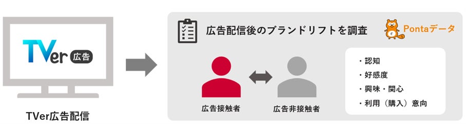 出稿したTVer広告が、ユーザーの態度変容にどれだけ寄与したのか、Ponta会員へのアンケートを通じて調査できます。広告接触者と広告非接触者に調査し、結果を比較することで、広告で訴求した商品・サービスに対する好感度や理解度などを可視化できます。商品の購入やサービスの申し込みなど、直接的な成果指標で評価しにくい商材において、TVer広告出稿の効果を把握することが可能となります。