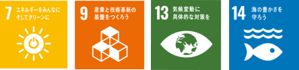 今回ご案内の取り組みは、SDGsの17のゴールのうち、特に7番、9番、13番、14番に貢献するものと考えています。