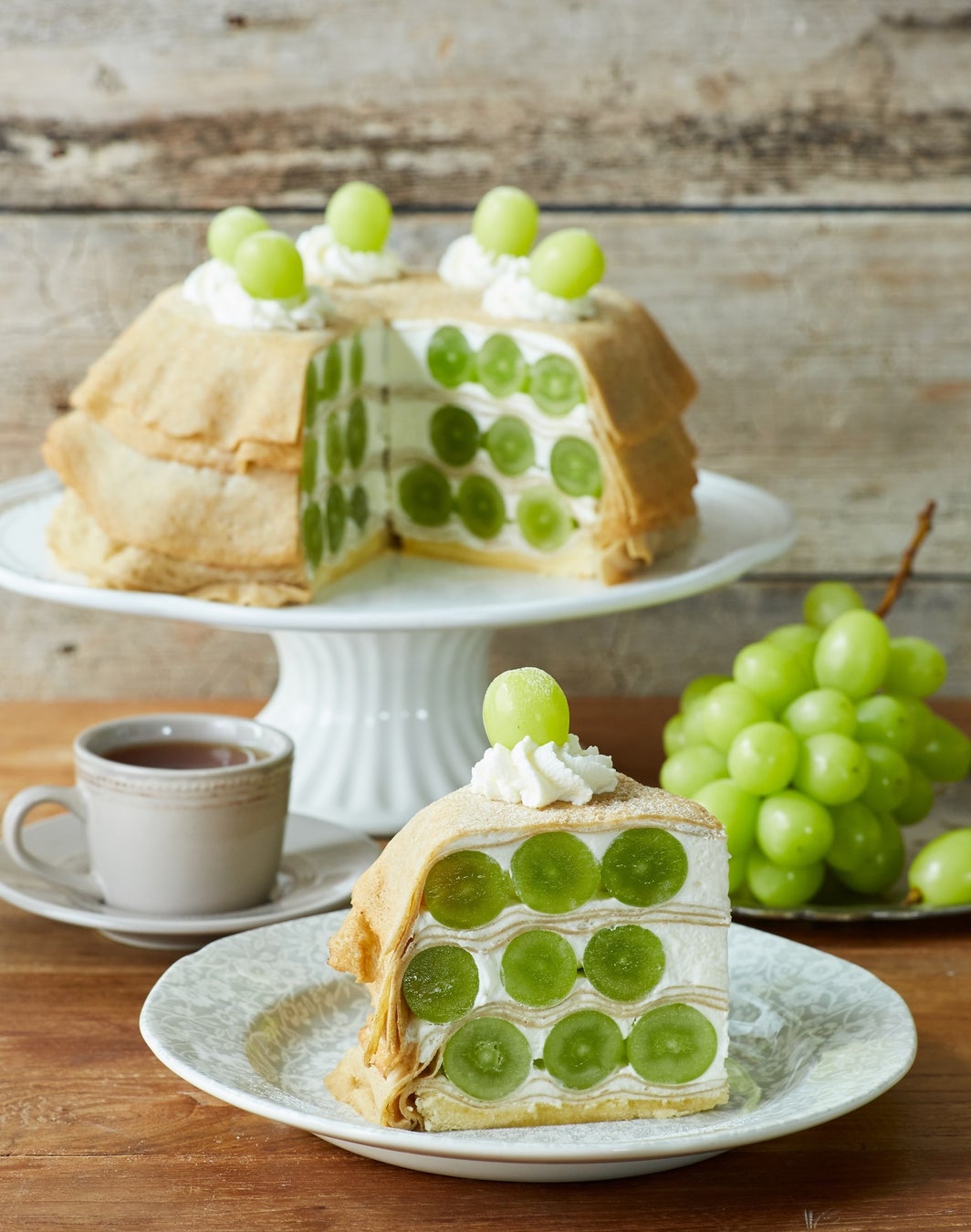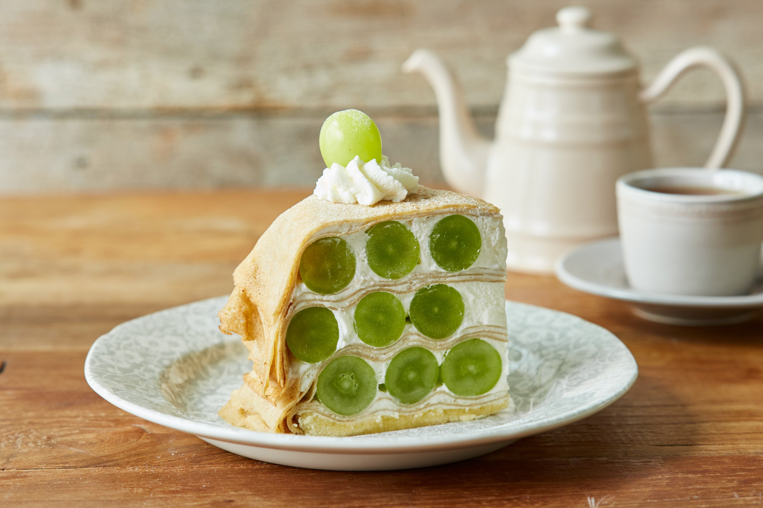 みずみずしさはじけるシャインマスカットを贅沢に使用し、上品な香りと甘さを引き立たせるマラスキーノ入りのホイップクリームを合わせた「シャインマスカットのミルクレープ」が今年の秋も全店に登場します。
