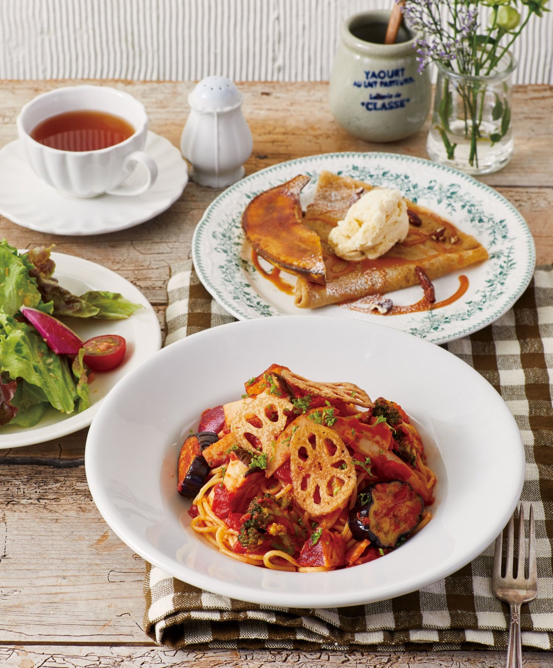 ごぼうや茄子、さつまいも、エリンギ、ベーコンなどをオーガニックトマトのソースと合わせた具沢山なパスタ。