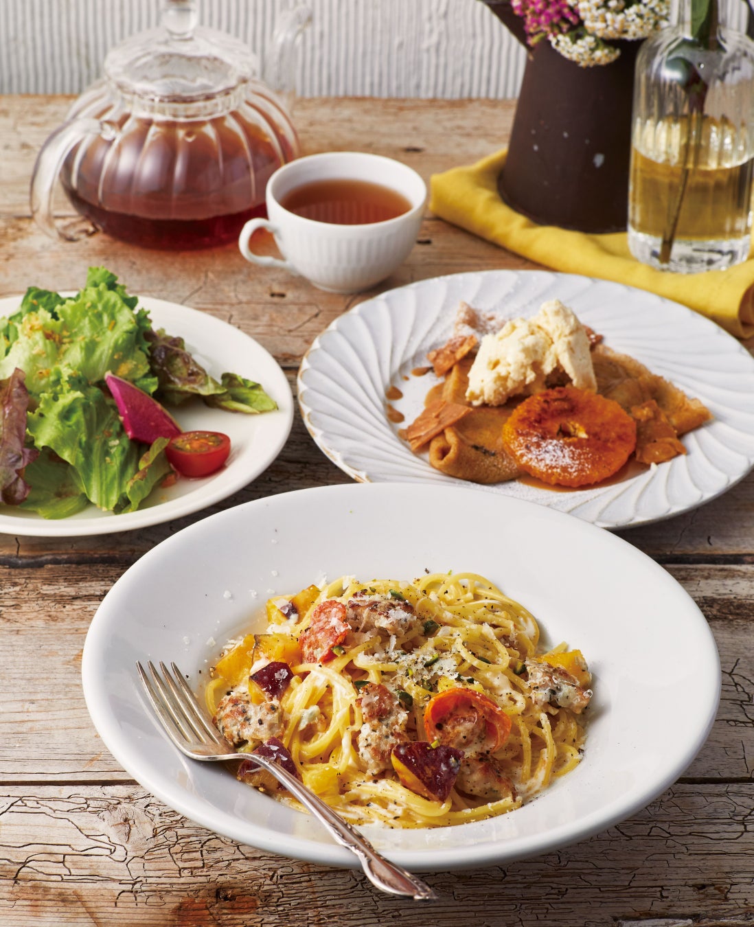 サルシッチャとセミドライトマト、ほっくり甘いさつまいもに、ゴルゴンゾーラチーズ入りのクリームソースを合わせました。ピスタチオとブラックペッパーがアクセント。